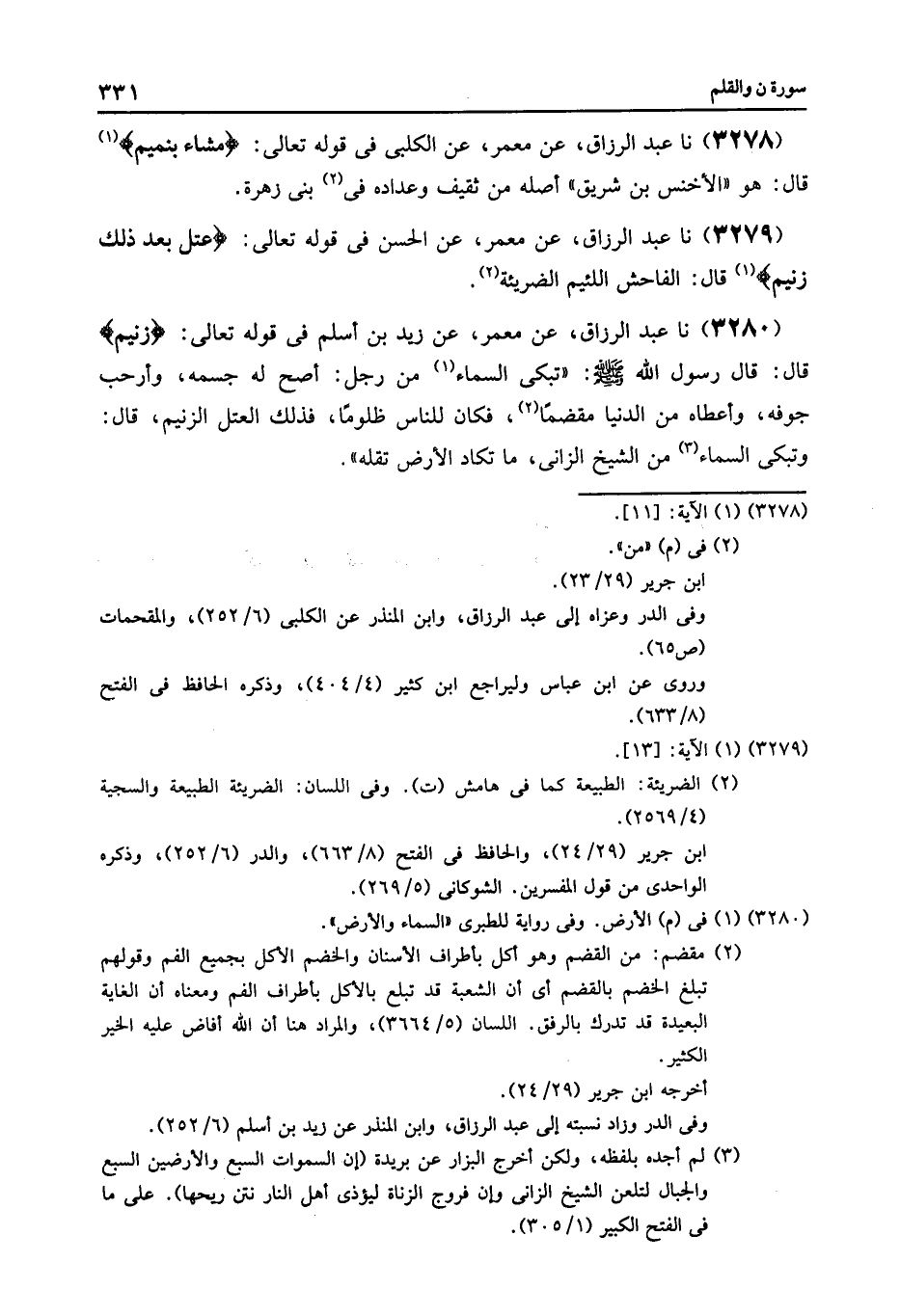 3280 - عَنْ مَعْمَرٍ , عَنْ زَيْدِ بْنِ أَسْلَمَ , فِي قَوْلِهِ تَعَالَى: {زَنِيمٍ} [القلم: 13] قَالَ: قَالَ رَسُولُ اللَّهِ صَلَّى اللهُ عَلَيْهِ وَسَلَّمَ: «تَبْكِي السَّمَاءُ مِنْ رَجُلٍ أَصَحَّ اللَّهُ له جِسْمَهُ , وَأَرْحَبَ جَوْفَهُ , وَأَعْطَاهُ مِنَ الدُّنْيَا مَقْضَمًا , فَكَانَ لِلنَّاسِ ظَلُومًا فَذَلِكَ الْعُتُلُّ الزَّنِيمُ» , قَالَ: «§وَتَبْكِي السَّمَاءُ مِنَ الشَّيْخِ الزَّانِي , مَا تَكَادُ الْأَرْضُ تُقِلُّهُ» نا عَبْدُ الرَّزَّاقِ