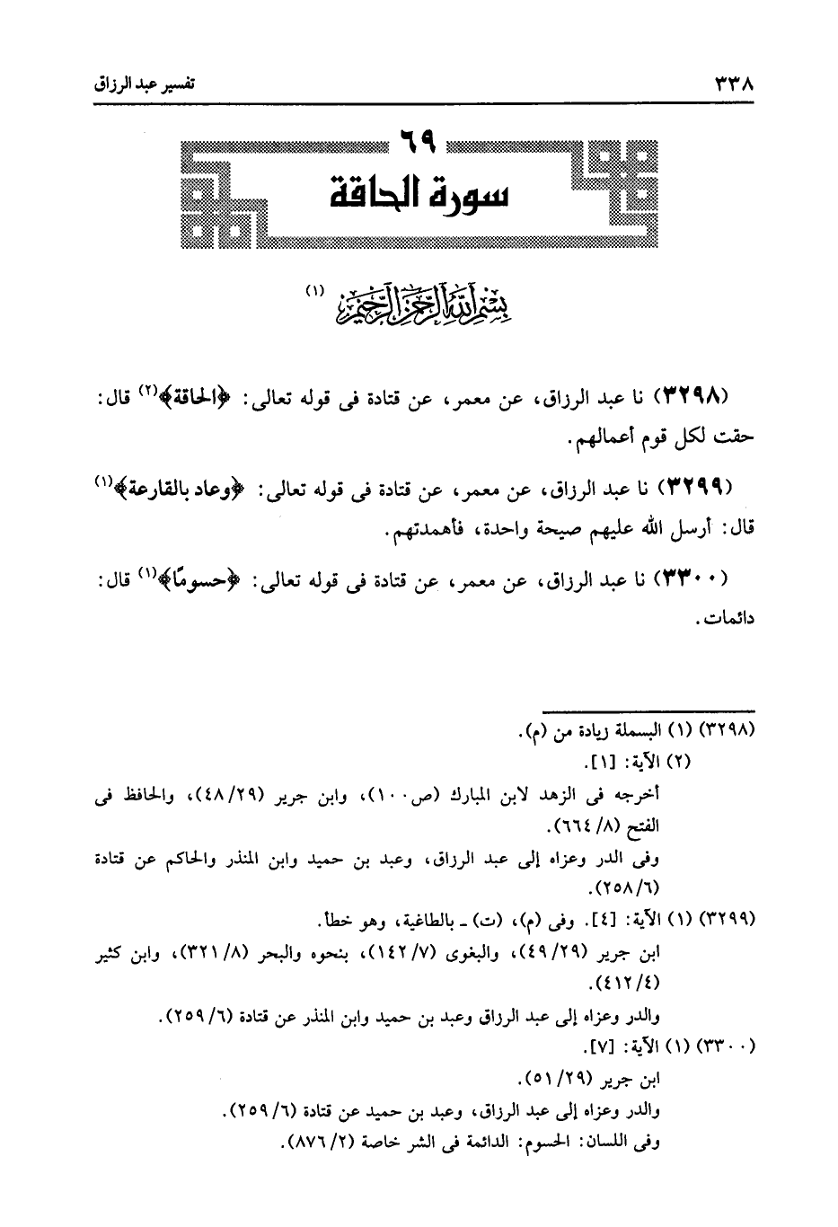 3298 - عَنْ مَعْمَرٍ , عَنْ قَتَادَةَ , فِي قَوْلِهِ تَعَالَى: {الْحَاقَّةُ} [الحاقة: 1] قَالَ: «§حَقَّتْ لِكُلِّ قَوْمٍ أَعْمَالَهُمْ»