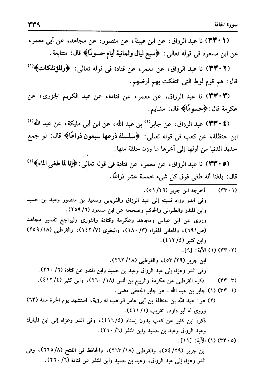3303 - عَنْ مَعْمَرٍ , عَنْ قَتَادَةَ عَنْ عَبْدِ الْكَرِيمِ الْجَزَرِيِّ , عَنْ عِكْرِمَةَ , قَالَ: {§حُسُومًا} [الحاقة: 7] قَالَ: «مَشَايِمٌ»
