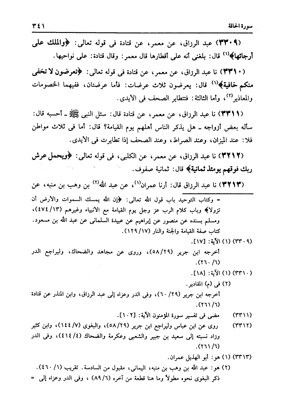 3309 - عَنْ مَعْمَرٍ , عَنْ قَتَادَةَ , فِي قَوْلِهِ تَعَالَى: {§وَالْمَلَكُ عَلَى أَرْجَائِهَا} [الحاقة: 17] قَالَ: «بَلَغَنِي أَنَّهُ عَلَى أَقْطَارِهَا» قَالَ مَعْمَرٌ , وَقَالَ قَتَادَةُ: عَلَى نَوَاحِيهَا