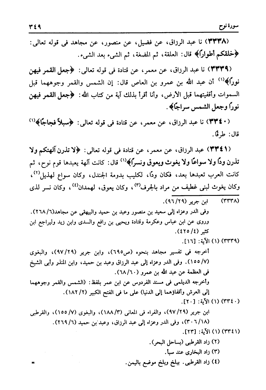 3339 - عَنْ مَعْمَرٍ , عَنْ قَتَادَةَ , فِي قَوْلِهِ تَعَالَى: {وَجَعَلَ الْقَمَرَ فِيهِنَّ نُورًا} [نوح: 16] أَنَّ عَبْدَ اللَّهِ بْنَ عَمْرِو بْنِ الْعَاصِ قَالَ: " إِنَّ §الشَّمْسَ وَالْقَمَرَ وُجُوهُهُمَا قِبَلَ السَّمَوَاتِ , وَأَقْفِيَتُهُمَا قِبَلَ الْأَرْضِ , وَأَنَا أَقْرَأُ بِذَلِكَ آيَةً مِنْ كِتَابِ اللَّهِ: {وَجَعَلَ الْقَمَرَ فِيهِنَّ نُورًا وَجَعَلَ الشَّمْسَ سِرَاجًا} [نوح: 16]