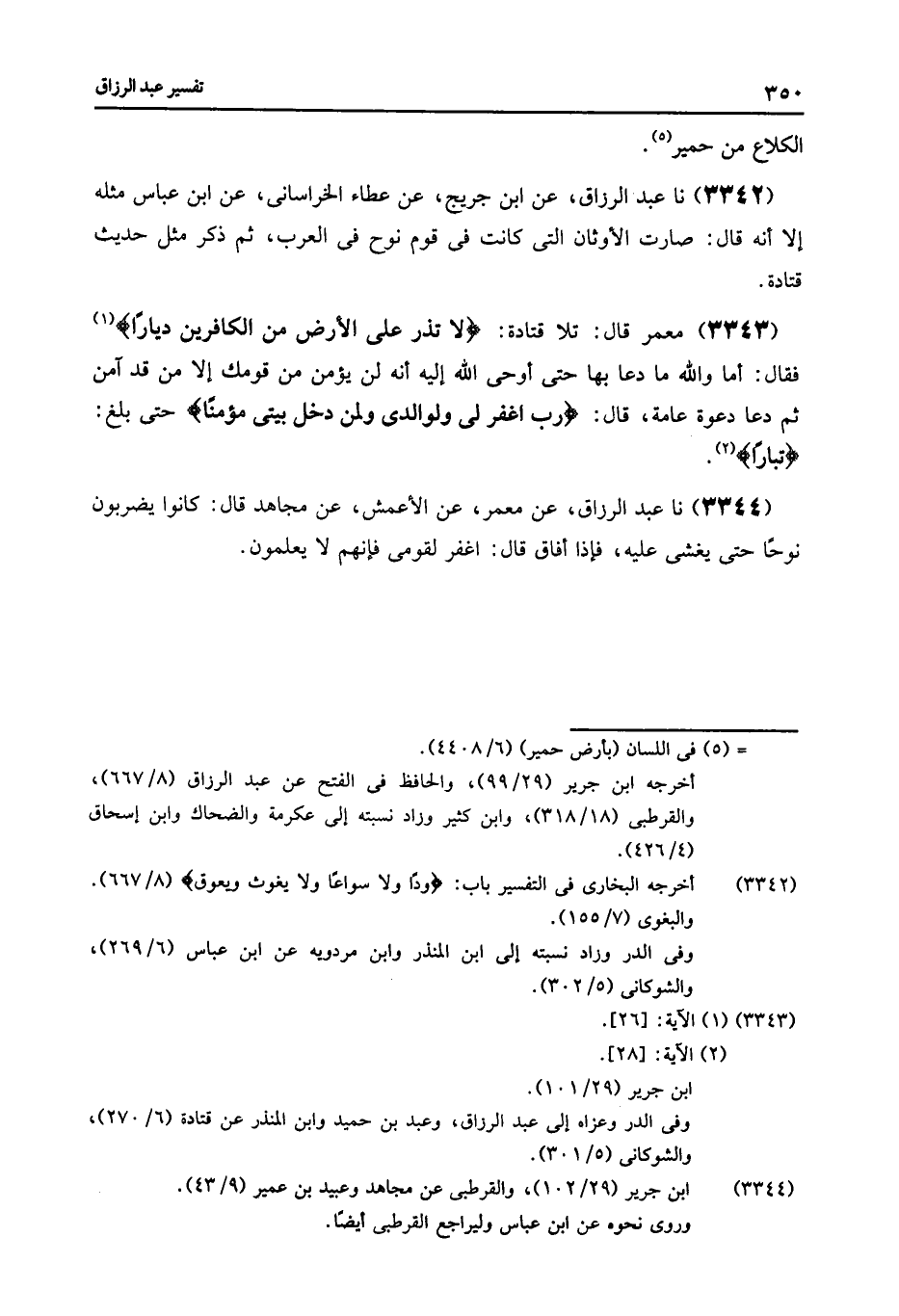 3343 - مَعْمَرٌ , قَالَ: تَلَا قَتَادَةُ {لَا تَذَرْ عَلَى الْأَرْضِ مِنَ الْكَافِرِينَ دَيَّارًا} [نوح: 26] فَقَالَ: " أَمَا §وَاللَّهِ مَا دَعَا بِهَا حَتَّى أَوْحَى اللَّهُ إِلَيْهِ {أَنَّهُ لَنْ يُؤْمِنَ مِنْ قَوْمِكَ إِلَّا مَنْ قَدْ آمَنَ} [هود: 36] , ثُمَّ دَعَا دَعْوَةً عَامَّةً قَالَ {رَبِّ اغْفِرْ لِي وَلِوَالِدَيَّ وَلِمَنَ دَخَلَ بَيْتِيَ مُؤْمِنًا} [نوح: 28] حَتَّى بَلَغَ {تَبَارًا} [نوح: 28]