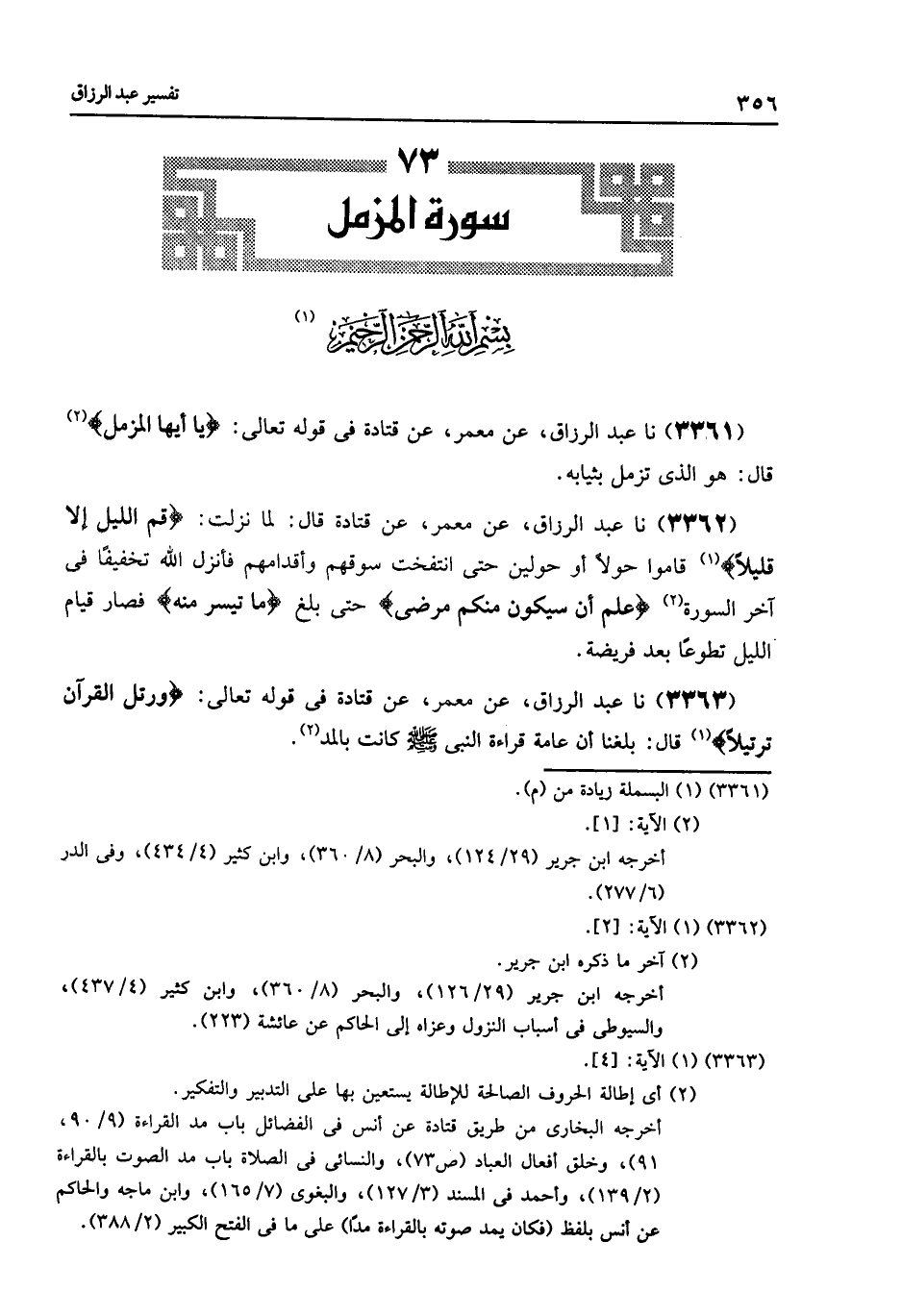 3361 - عَنْ مَعْمَرٍ , عَنْ قَتَادَةَ , فِي قَوْلِهِ تَعَالَى: {يَا أَيُّهَا الْمُزَّمِّلُ} [المزمل: 1] قَالَ: «§هُوَ الَّذِي تَزَمَّلَ بِثِيَابِهِ»