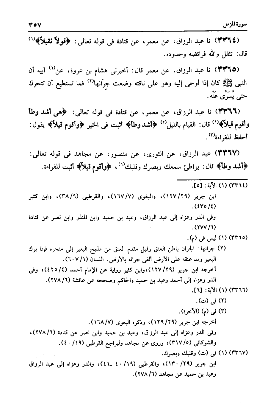 3366 - عَنْ مَعْمَرٍ , عَنْ قَتَادَةَ , فِي قَوْلِهِ تَعَالَى: {هِيَ أَشَدُّ وَطْئًا وَأَقُومُ قِيلًا} قَالَ: " §الْقِيَامُ باللَّيْلِ أَشَدُّ وَطْأً , أَثْبَتُ فِي الْخَيْرِ {وَأَقُومُ قِيلًا} [المزمل: 6] يَقُولُ: أَحْفَظُ لِلْقِرَاءَةِ "