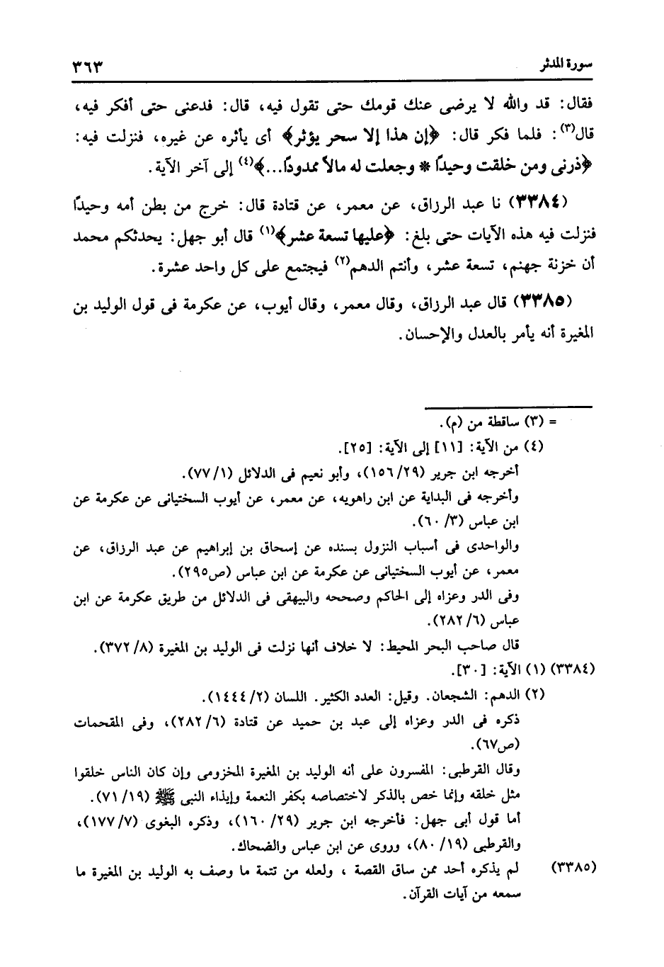 3384 - عَنْ مَعْمَرٌ: عَنْ قَتَادَةُ قَالَ: خَرَجَ مِنْ بَطْنِ أُمِّهِ وَحِيدًا: فَنَزَلَتْ فِيهِ هَذِهِ الْآيَاتُ حَتَّى بَلَغَ {§عَلَيْهَا تِسْعَةَ عَشَرَ} [المدثر: 30] قَالَ أَبُو جَهْلٍ: يُحَدِّثُكُمْ مُحَمَّدٌ أَنَّ خَزَنَةَ جَهَنَّمَ , تِسْعَةَ عَشَرَ , وَأَنْتُمُ الدُّهْمُ , فَيَجْتَمِعُ عَلَى كُلِّ وَاحِدٍ عَشَرَةٌ "