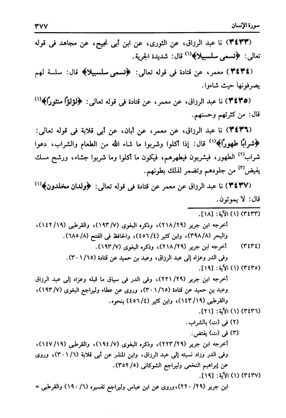 3435 - عَنْ مَعْمَرٍ , عَنْ قَتَادَةَ , فِي قَوْلِهِ تَعَالَى: {لُؤْلُؤًا مَنْثُورًا} [الإنسان: 19] قَالَ: «§مِنْ كَثْرَتِهِمْ وَحُسْنِهِمْ»