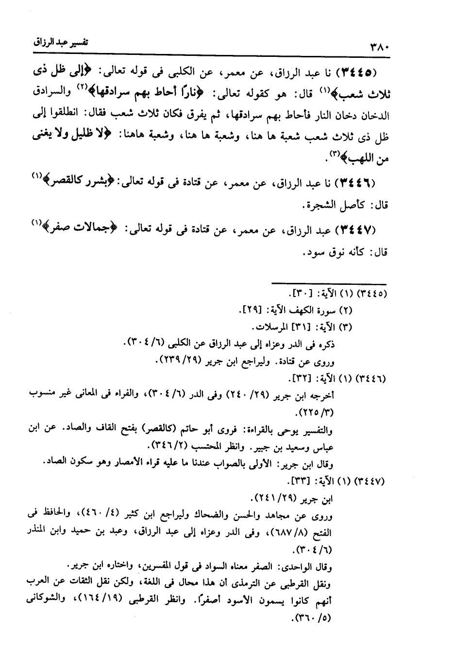 3447 - عَنْ مَعْمَرٍ , عَنْ قَتَادَةَ , فِي قَوْلِهِ تَعَالَى: {§جِمَالَتٌ صُفْرٌ} [المرسلات: 33] قَالَ: «كَأَنَّهُ نُوقٌ سُودٌ»