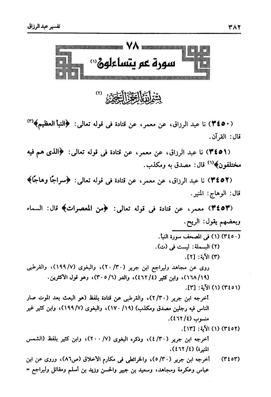 3450 - عَنْ مَعْمَرٍ , عَنْ قَتَادَةَ , فِي قَوْلِهِ تَعَالَى: {§النَّبَإِ الْعَظِيمِ} [النبأ: 2] قَالَ: «الْقُرْآنُ»
