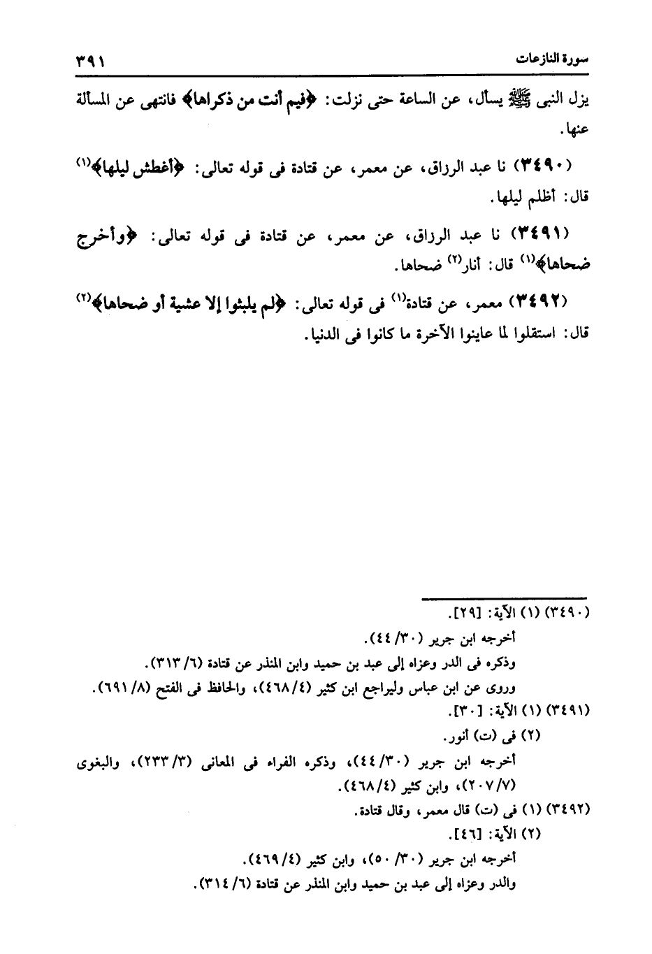 3491 - عَنْ مَعْمَرٍ , عَنْ قَتَادَةَ , فِي قَوْلِهِ تَعَالَى: {§وَأَخْرَجَ ضُحَاهَا} [النازعات: 29] قَالَ: «أَناَرَ ضُحَاهَا»