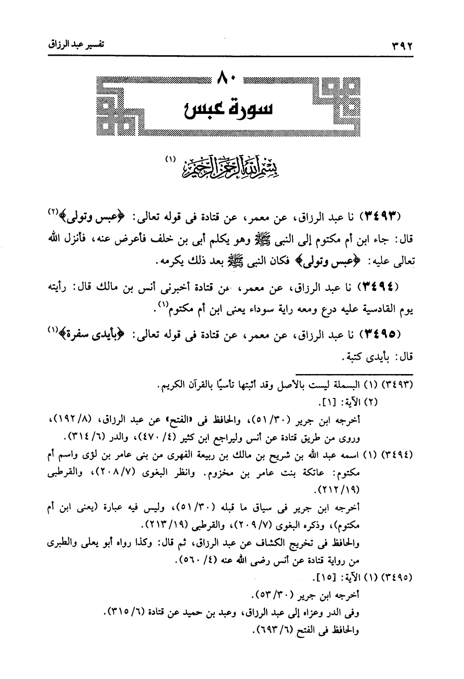 3493 - عَنْ مَعْمَرٍ , عَنْ قَتَادَةَ , فِي قَوْلِهِ تَعَالَى: {عَبَسَ وَتَوَلَّى} [عبس: 1] قَالَ: جَاءَ ابْنُ أُمِّ مَكْتُومٍ إِلَى النَّبِيِّ صَلَّى اللهُ عَلَيْهِ وَسَلَّمَ , وَهُوَ يُكَلِّمُ أُبَيَّ بْنَ خَلَفٍ فَأَعْرَضَ عَنْهُ , فَأَنْزَلَ اللَّهُ تَعَالَى عَلَيْهِ {§عَبَسَ وَتَوَلَّى} [عبس: 1] قَالَ: «فَكَانَ النَّبِيُّ صَلَّى اللهُ عَلَيْهِ وَسَلَّمَ , بَعْدَ ذَلِكَ يُكْرِمُهُ»