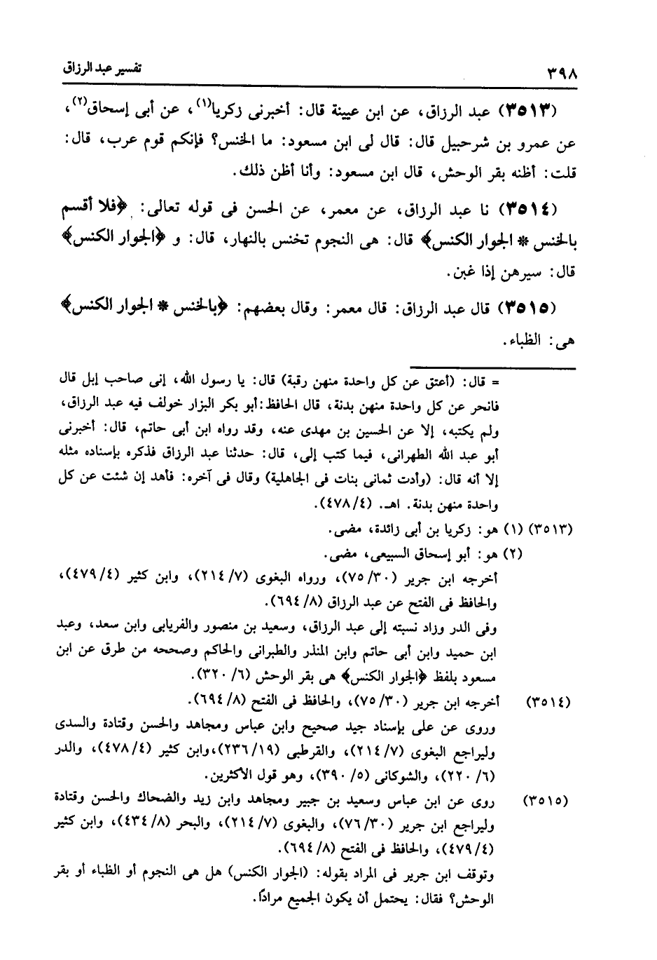 3515 - قَالَ عَبْدُ الرَّزَّاقِ قَالَ مَعْمَرٌ , وَقَالَ بَعْضُهُمْ: {§بِالْخُنَّسِ الْجِوَارِ الْكُنَّسِ} [التكوير: 16] : «هِيَ الظِّبَاءُ»