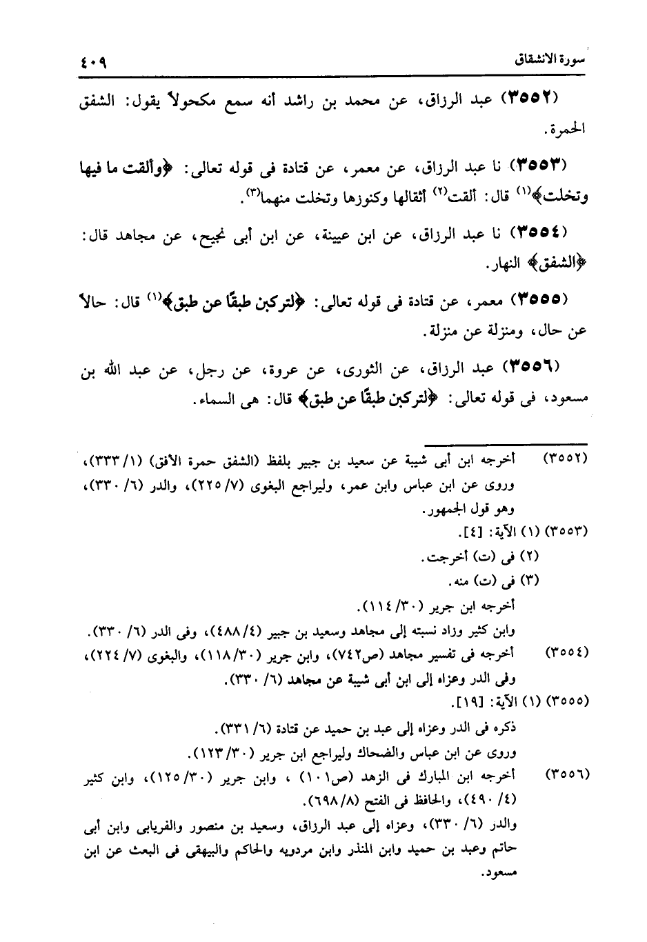 3555 - مَعْمَرٌ , عَنْ قَتَادَةَ , فِي قَوْلِهِ تَعَالَى: {لَتَرْكَبُنَّ طَبَقًا عَنْ طَبَقٍ} [الانشقاق: 19] قَالَ: «§حَالًا عَنْ حَالٍ , وَمَنْزِلَةً عَنْ مَنْزِلَةٍ»