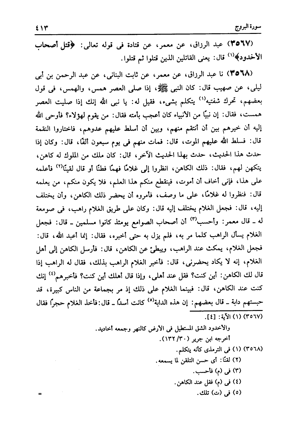 3568 - عَنْ مَعْمَرٍ , عَنْ ثَابِتٍ الْبُنَانِيِّ , عَنْ عَبْدِ الرَّحْمَنِ بْنِ أَبِي لَيْلَى , عَنْ صُهَيْبٍ , قَالَ: كَانَ النَّبِيُّ صَلَّى اللهُ عَلَيْهِ وَسَلَّمَ: إِذَا صَلَّى الْعَصْرَ هَمَسَ - وَالْهَمْسُ , فِي قَوْلِ بَعْضِهِمْ , تَحَرُّكُ شَفَتَيْهِ كَأَنَّهُ يَتَكَلَّمُ بشيْءٍ - فَقِيلَ لَهُ: يَا نَبِيَّ اللَّهِ إِنَّكَ إِذَا صَلَّيْتَ الْعَصْرَ هَمَسْتَ , فَقَالَ: " إِنَّ نَبِيًّا مِنَ الْأَنْبِيَاءِ كَانَ أُعْجِبَ بِأُمَّتِهِ , فَقَالَ: مَنْ يَقُومُ لِهَؤُلَاءِ؟ فَأَوْحَى اللَّهُ إِلَيْهِ أَنْ خَيِّرْهُمْ بَيْنَ أَنْ أَنْتَقِمَ مِنْهُمْ , وَبَيْنَ أَنْ أُسَلِّطَ عَلَيْهِمْ عَدُوَّهُمْ , فَاخْتَارُوا النِّقْمَةَ , قَالَ: فَسَلَّطَ اللَّهُ عَلَيْهِمُ الْمَوْتَ , قال فَمَاتَ مِنْهُمْ فِي يَوْمٍ سَبْعُونَ أَلْفًا , قَالَ: وَكَانَ إِذَا حَدَّثَ هَذَا الْحَدِيثِ , حَدَّثَ بِهَذَا الْحَدِيثِ الْآخَرِ , قَالَ: كَانَ مَلِكٌ مِنَ الْمُلُوكِ لَهُ كَاهِنٌ يَتَكَهَّنُ لَهُمْ , فَقَالَ ذَلِكَ الْكَاهِنُ: انْظُرُوا إِلَيَّ غُلَامًا فَهِمًا فَطِنًا أَوْ قَالَ: لَقِينًا فَأُعَلِّمَهُ عِلْمِي هَذَا , فَإِنِّي أَخَافُ أَنْ أَمُوتَ , فَيَنْقَطِعَ مِنْكُمْ هَذَا الْعِلْمُ , فَلَا يَكُونَ مِنْكُمْ مَنْ يَعْلَمُهُ , قَالَ: فَنَظَرُوا لَهُ غُلَامًا عَلَى مَا وَصَفَ , فَأَمَرُوهُ أَنْ يَحْضُرَ ذَلِكَ الْكَاهِنَ , وَأَنْ يَخْتَلِفَ إِلَيْهِ , قَالَ: فَجَعَلَ الْغُلَامُ يَخْتَلِفُ إِلَيْهِ , قَالَ: وَكَانَ عَلَى طَرِيقِ الْغُلَامِ رَاهِبٌ فِي صَوْمَعَةٍ لَهُ - قَالَ مَعْمَرٌ: وَأَحْسَبُ أَنَّ أَصْحَابَ الصَّوَامِعِ يَوْمَئِذٍ كَانُوا مُسْلِمِينَ - قَالَ: فَجَعَلَ الْغُلَامُ يَسْأَلُ الرَّاهِبَ كُلَّمَا مَرَّ بِهِ , فَلَمْ يَزَلْ بِهِ حَتَّى أَخْبَرَهُ , فَقَالَ: إِنَّمَا أَعْبُدُ اللَّهَ , -[414]- قَالَ: فَجَعَلَ الْغُلَامُ يَمْكُثُ عِنْدَ الرَّاهِبِ , وَيُبْطِئُ عَنِ الْكَاهِنِ , قَالَ: فَأَرْسَلَ الْكَاهِنُ إِلَى أَهْلِ الْغُلَامِ , إِنَّهُ لَا يَكَادُ يَحْضُرُنِي , قَالَ: فَأَخْبَرَ الْغُلَامُ الرَّاهِبَ بِذَلِكَ , فَقَالَ لَهُ الرَّاهِبُ: إِذَا قَالَ لَكَ الْكَاهِنُ أَيْنَ كُنْتَ؟ فَقُلْ: عِنْدَ أَهْلِي , وَإِذَا قَالَ أَهْلُكَ: أَيْنَ كُنْتَ؟ فَأَخْبِرْهُمْ إِنَّكَ كُنْتَ عِنْدَ الْكَاهِنِ , قَالَ: فَبَيْنَمَا الْغُلَامُ عَلَى ذَلِكَ إِذْ مَرَّ بِجَمَاعَةٍ مِنَ النَّاسِ كَبِيرَةٍ , قَدْ حَبَسَتْهُمْ دَابَّةٌ , قَالَ بَعْضُهُمْ: إِنَّ هَذِهِ الدَّابَّةَ كَانَتْ أَسَدًا , قَالَ: فَأَخَذَ الْغُلَامُ حَجَرًا فَقَالَ: اللَّهُمَّ إِنْ كَانَ مَا يَقُولُ الرَّاهِبُ حَقًّا فَأَسْأَلُكَ أَنْ أَقْتُلَ هَذِهِ الدَّابَّةَ , وَإِنْ كَانَ مَا يَقُولُ الْكَاهِنُ حَقًّا فَأَسْأَلُكَ أَنْ لَا أَقْتُلَهَا , ثُمَّ رَمَى فَقَتَلَ الدَّابَّةَ , فَقَالَ النَّاسُ: مَنْ قَتَلَهَا؟ فَقَالُوا الْغُلَامُ , فَفَزِعَ النَّاسُ إِلَيْهِ , وَقَالُوا قَدْ عَلِمَ هَذَا الْغُلَامُ عِلْمًا لَمْ يَعْلَمْهُ أَحَدٌ , قَالَ: فَسَمِعَ بِهِ أَعْمًى , فَجَاءَهُ فَقَالَ لَهُ الْأَعْمَى: إِنْ أَنْتَ رَدَدْتَ بَصَرِي فَإِنَّ لَكَ كَذَا وَكَذَا , فَقَالَ الْغُلَامُ: لَا أُرِيدُ مِنْكَ هَذَا وَلَكِنْ أَرَأَيْتَ إِنْ رَجَعَ إِلَيْكَ بَصَرُكَ أَتُؤْمِنُ بِالَّذِي رَدَّهُ عَلَيْكَ؟ قَالَ: نَعَمْ , قَالَ: فَدَعَا اللَّهَ فَرَدَّ إِلَيْهِ بَصَرَهُ , قَالَ: فَآمَنَ الْأَعْمَى , قَالَ: فَبَلَغَ الْمَلِكَ أَمْرُهُمْ , فَبَعَثَ إِلَيْهِمْ فَأُتِيَ بِهِمْ , فَقَالَ: لَأَقْتُلَنَّ كُلَّ وَاحِدٍ مِنْكُمْ قِتْلَةً , لَا أَقْتُلُ بِهَا صَاحِبَهُ , قَالَ: فَأَمَرَ بِالرَّاهِبِ , وَبِالرَّجُلِ الَّذِي كَانَ أَعْمًى فَوَضَعَ الْمِنْشَارَ عَلَى مَفْرِقِ أَحَدِهِمَا فَقَتَلَهُ , وَقَتَل