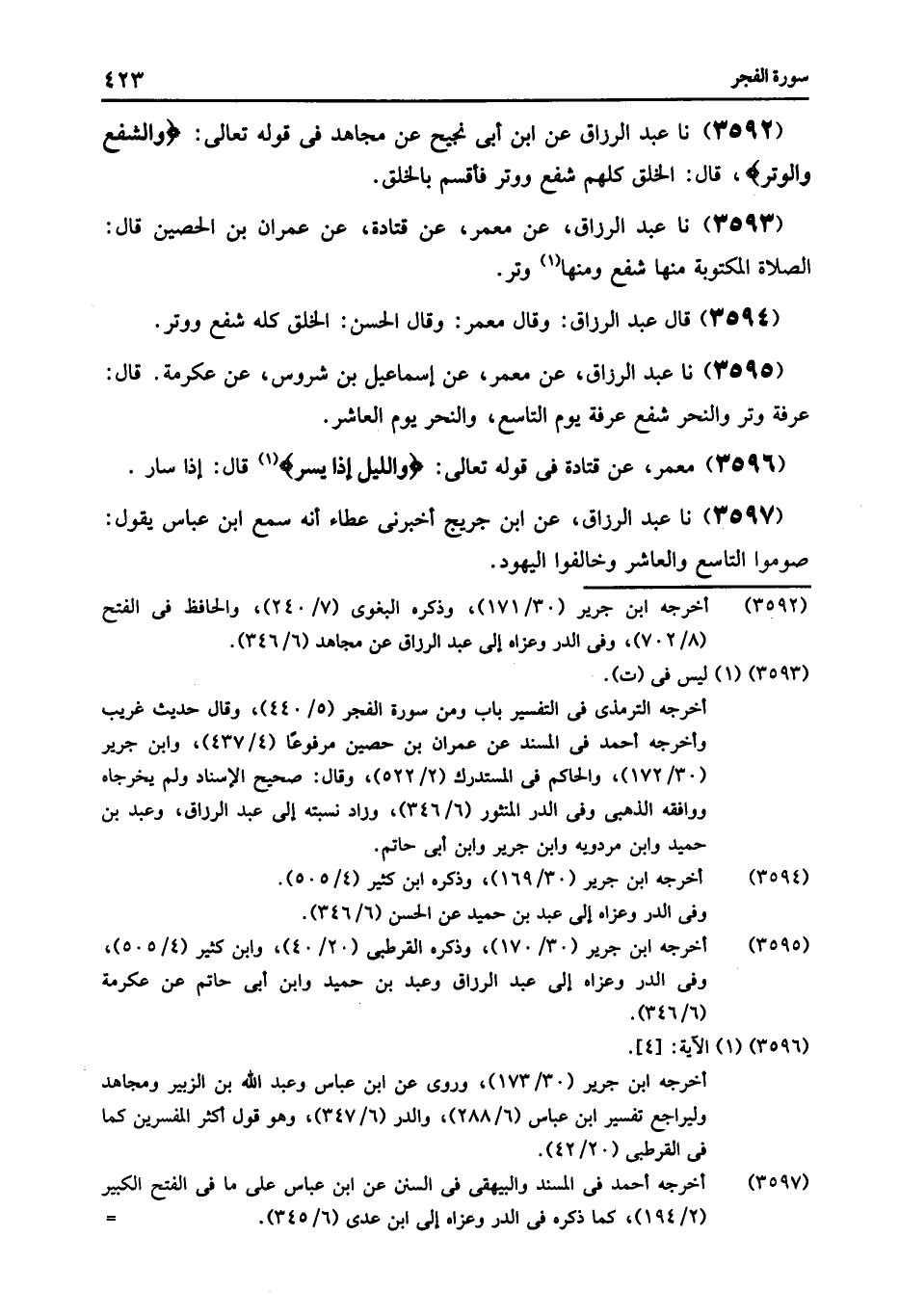 3592 - عَنِ ابْنِ أَبِي نَجِيحٍ , عَنْ مُجَاهِدٍ , فِي قَوْلِهِ تَعَالَى: {وَالشَّفْعِ وَالْوِتْرِ} [الفجر: 3] قَالَ: «§الْخَلْقُ كُلُّهُمْ شَفْعٌ , وَوَتْرٌ , فَأَقْسَمَ بِالْخَلْقِ»