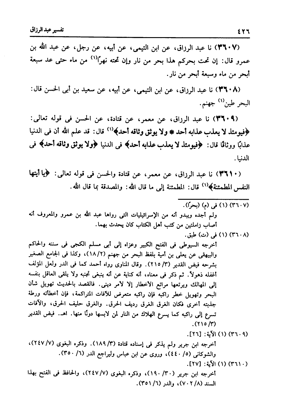 3606 - عَنْ مَعْمَرٍ , عَنْ أَبَانَ , عَنْ رَجُلٍ , عَنْ أَبِي وَائِلٍ , فِي قَوْلِهِ تَعَالَى: {وَجِيءَ يَوْمَئِذٍ بِجَهَنَّمَ} [الفجر: 23] قَالَ: «§جِيءَ بِهَا مَزْمُومَةً»