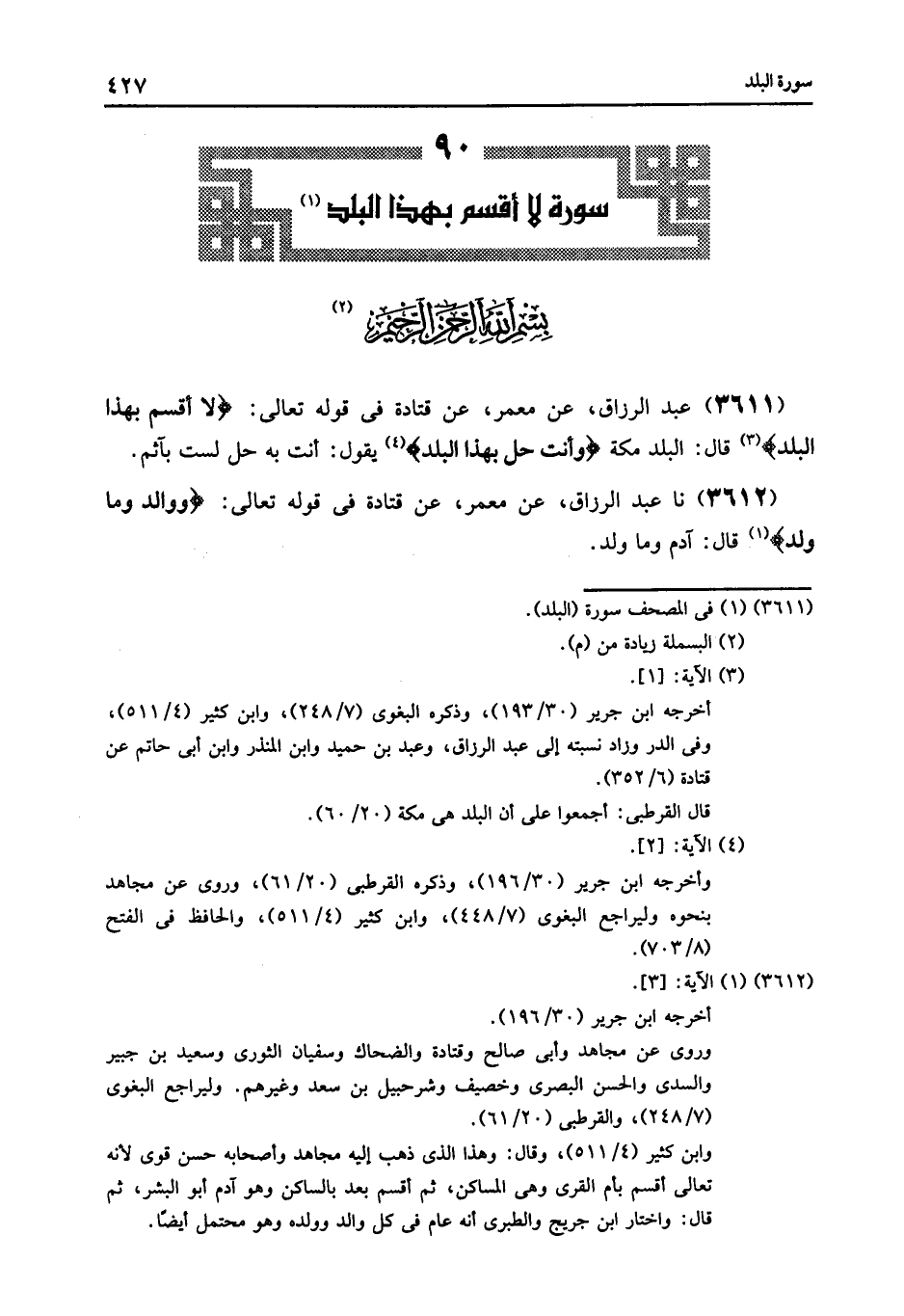 3611 - عَنْ مَعْمَرٍ , عَنْ قَتَادَةَ , فِي قَوْلِهِ تَعَالَى: {لَا أُقْسِمُ بِهَذَا الْبَلَدِ} [البلد: 1] قَالَ: " §الْبَلَدُ مَكَّةُ وَأَنْتَ حِلٌّ بِهَذَا الْبَلَدِ , يَقُولُ: أَنْتَ بِهِ حِلٌّ وَلَسْتَ بِآثِمٍ "