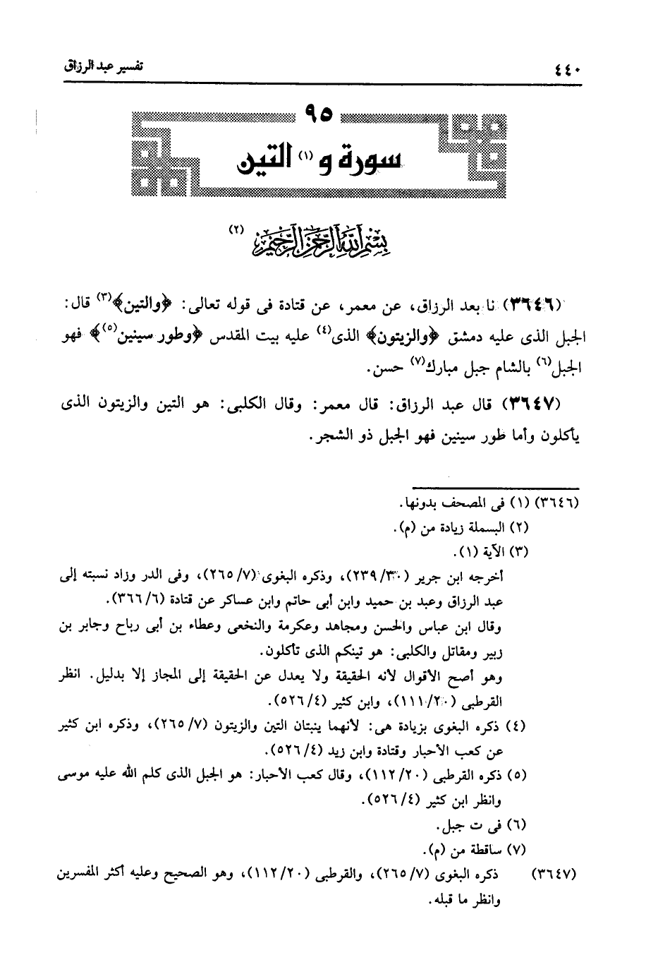 3646 - عَنْ مَعْمَرٍ , عَنْ قَتَادَةَ , فِي قَوْلِهِ تَعَالَى: {§وَالتِّينِ} [التين: 1] قَالَ: " الْجَبَلُ الَّذِي عَلَيْهِ دِمَشْقُ , {وَالزَّيْتُونِ} [الأنعام: 99] : الَّذِي عَلَيْهِ بَيْتُ الْمَقْدِسِ , {وَطُورِ سِينِينَ} [التين: 2] فَهُوَ الْجَبَلُ بِالشَّامِ جَبَلٌ مُبَارَكٌ حَسَنٌ "
