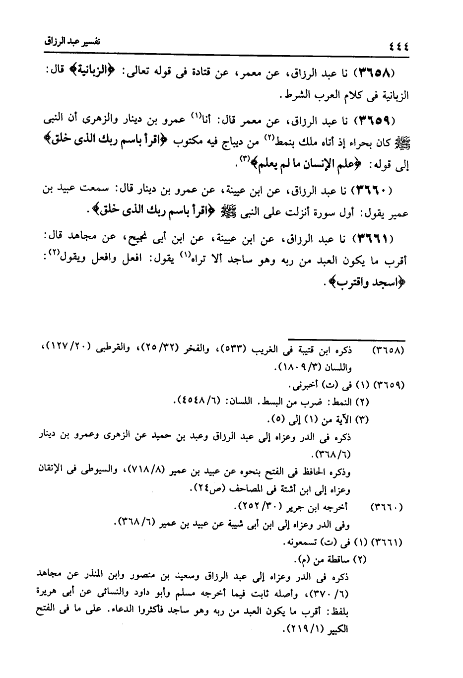 3658 - عَنْ مَعْمَرٍ , عَنْ قَتَادَةَ , فِي قَوْلِهِ تَعَالَى: {الزَّبَانِيَةَ} [العلق: 18] قَالَ: «§الزَّبَانِيَةُ فِي كَلَامِ الْعَرَبِ الشُّرَطُ»