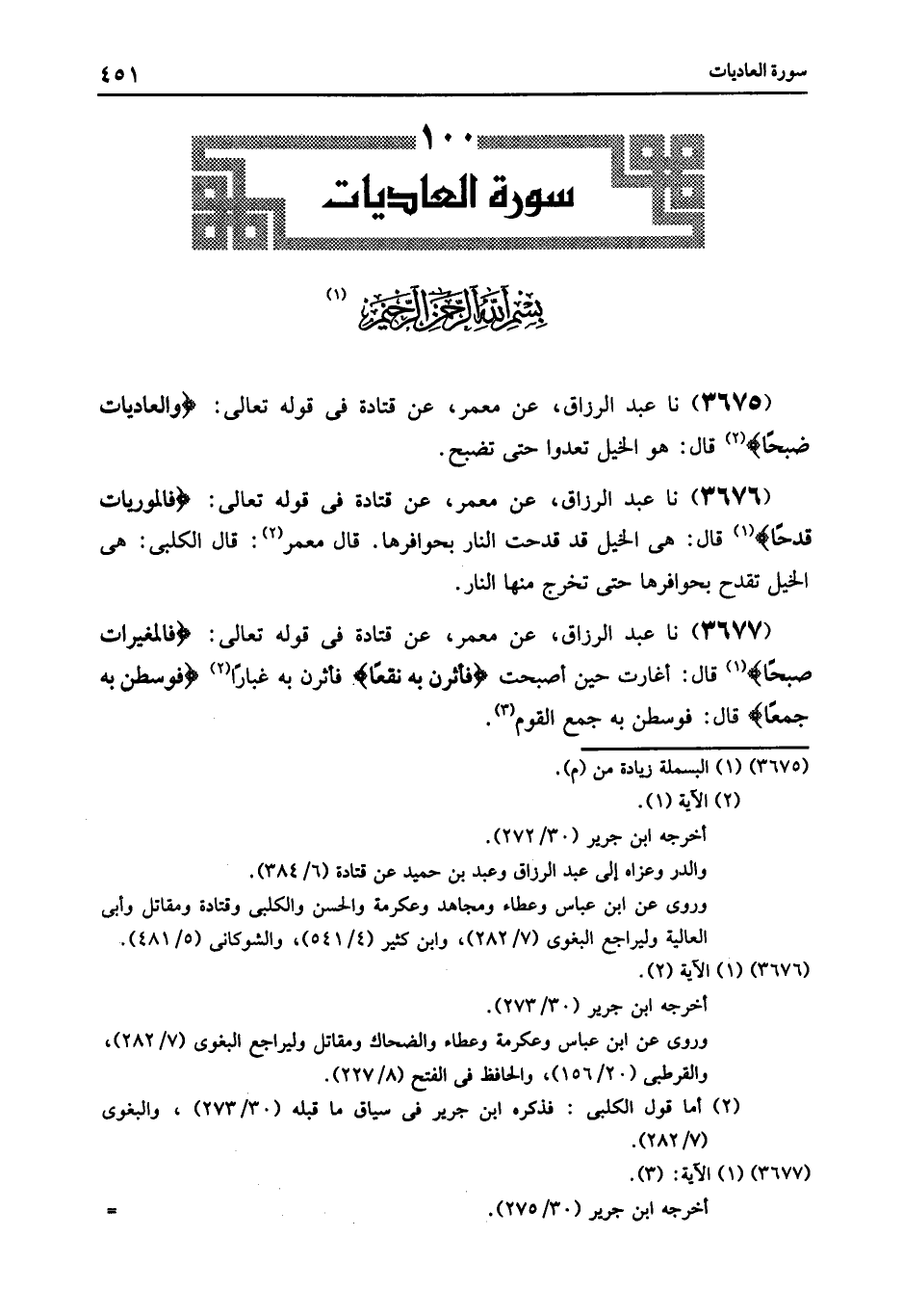 3677 - عَنْ مَعْمَرٍ , عَنْ قَتَادَةَ , فِي قَوْلِهِ تَعَالَى: {فَالْمُغِيرَاتِ صُبْحًا} [العاديات: 3] قَالَ: أَغَارَتْ حِينَ أَصْبَحَتْ {فَأَثَرْنَ بِهِ نَقْعًا} [العاديات: 4] : «§فَأَثَرْنَ بِهِ غُبَارًا» , {فَوَسَطْنَ بِهِ جَمْعًا} [العاديات: 5] قَالَ: «فَوَسَطْنَ بِهِ جَمْعَ الْقَوْمِ»