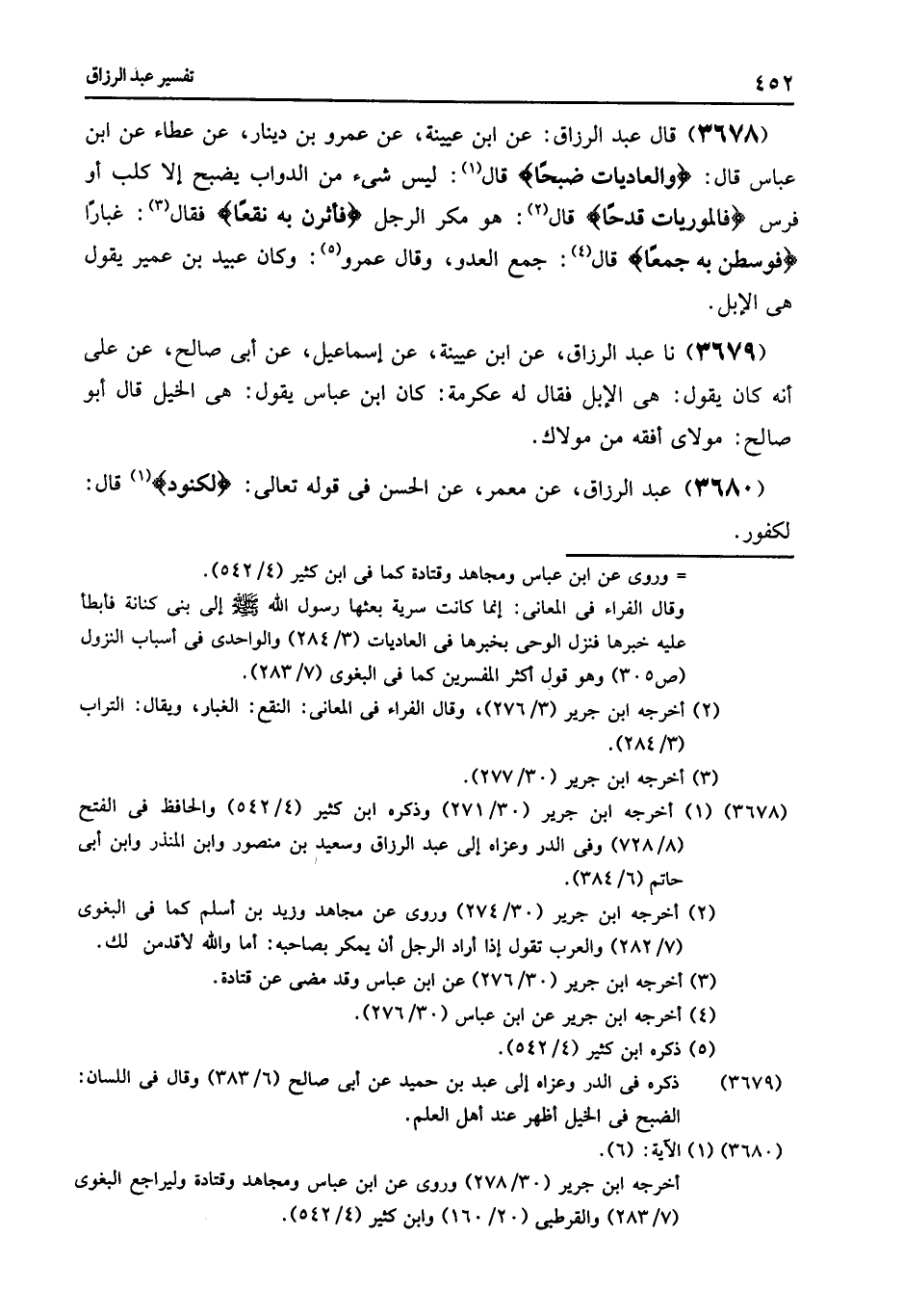 3678 - عَنِ ابْنِ عُيَيْنَةَ , عَنْ عَمْرِو بْنِ دِينَارٍ , عَنْ عَطَاءٍ , عَنِ ابْنِ عَبَّاسٍ , قَالَ: {وَالْعَادِيَاتِ ضَبْحًا} [العاديات: 1] قَالَ: " §لَيْسَ شَيْءٌ مِنَ الدَّوَابِّ يَضْبَحُ , إِلَّا كَلْبٌ , أَوْ فَرَسٌ {فَالْمُورِيَاتِ قَدْحًا} [العاديات: 2] قَالَ: «هُوَ مَكْرُ الرَّجُلِ» , {فَأَثَرْنَ بِهِ نَقْعًا} [العاديات: 4] فَقَالَ: " غُبَارًا {فَوَسَطْنَ بِهِ جَمْعًا} [العاديات: 5] قَالَ: «جَمْعَ الْعَدُوِّ» وَقَالَ عَمْرٌو: وَكَانَ عُبَيْدُ بْنُ عُمَيْرٍ يَقُولُ: هِيَ الْإِبِلُ