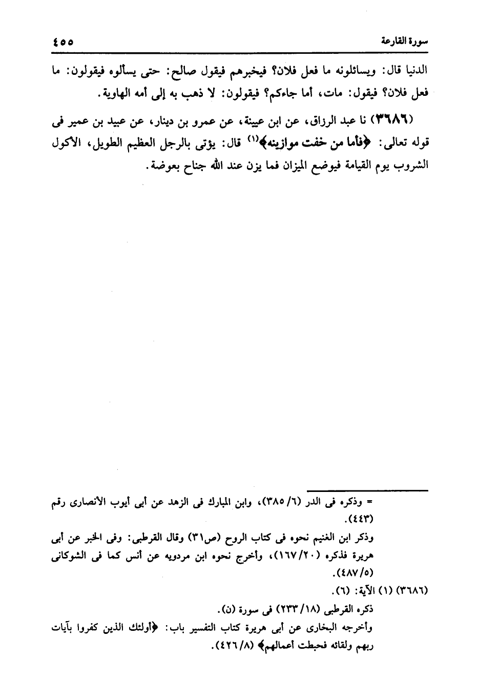 3686 - عَنِ ابْنِ عُيَيْنَةَ , عَنْ عَمْرِو بْنِ دِينَارٍ , عَنْ عُبَيْدِ بْنِ عُمَيْرٍ , فِي قَوْلِهِ تَعَالَى: {وَأَمَّا مَنْ خَفَّتْ مَوَازِينُهُ} [القارعة: 8] قَالَ: «§يُؤْتَى بِالرَّجُلِ الْعَظِيمِ الطَّوِيلِ الْأَكُولِ الشَّرُوبِ يَوْمَ الْقِيَامَةِ , فَيُوضَعُ الْمِيزَانُ فَمَا يَزِنُ عِنْدَ اللَّهِ جَنَاحَ بَعُوضَةٍ»