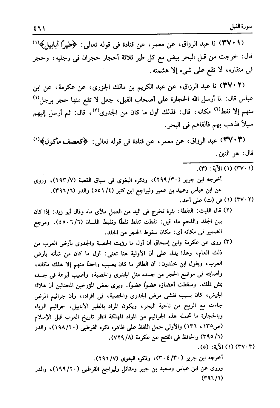 3701 - عَنْ مَعْمَرٍ , عَنْ قَتَادَةَ , فِي قَوْلِهِ تَعَالَى: {طَيْرًا أَبَابِيلَ} [الفيل: 3] قَالَ: «§خَرَجَتْ مِنْ قِبَلِ الْبَحْرِ بِيضٌ مَعَ كُلِّ طَيْرٍ ثَلَاثَةُ أَحْجَارٍ , حَجَرَانِ فِي رِجْلَيْهِ , وَحَجَرٌ فِي مِنْقَارِهِ , لَا تَقَعُ عَلَى شَيْءٍ إِلَّا هَشَّمَتْهُ»