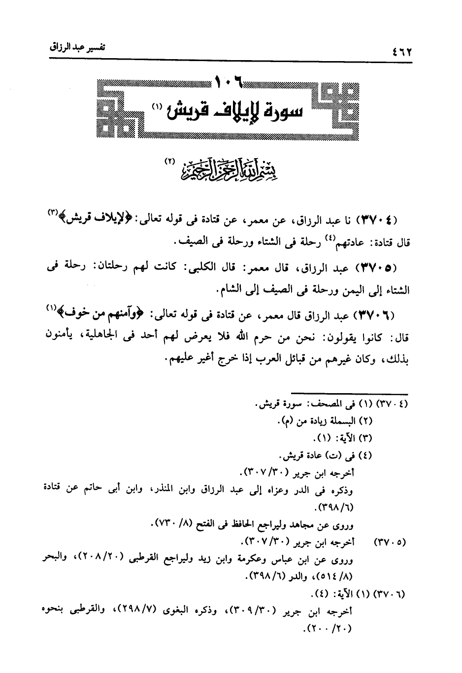3704 - عَنْ مَعْمَرٍ , عَنْ قَتَادَةَ , فِي قَوْلِهِ تَعَالَى: {لِإِيلَافِ قُرَيْشٍ} [قريش: 1] قَالَ قَتَادَةَ: «§عَادَتُهُم رِحْلَةٌ فِي الشِّتَاءِ , وَرِحْلَةٌ فِي الصَّيْفِ»