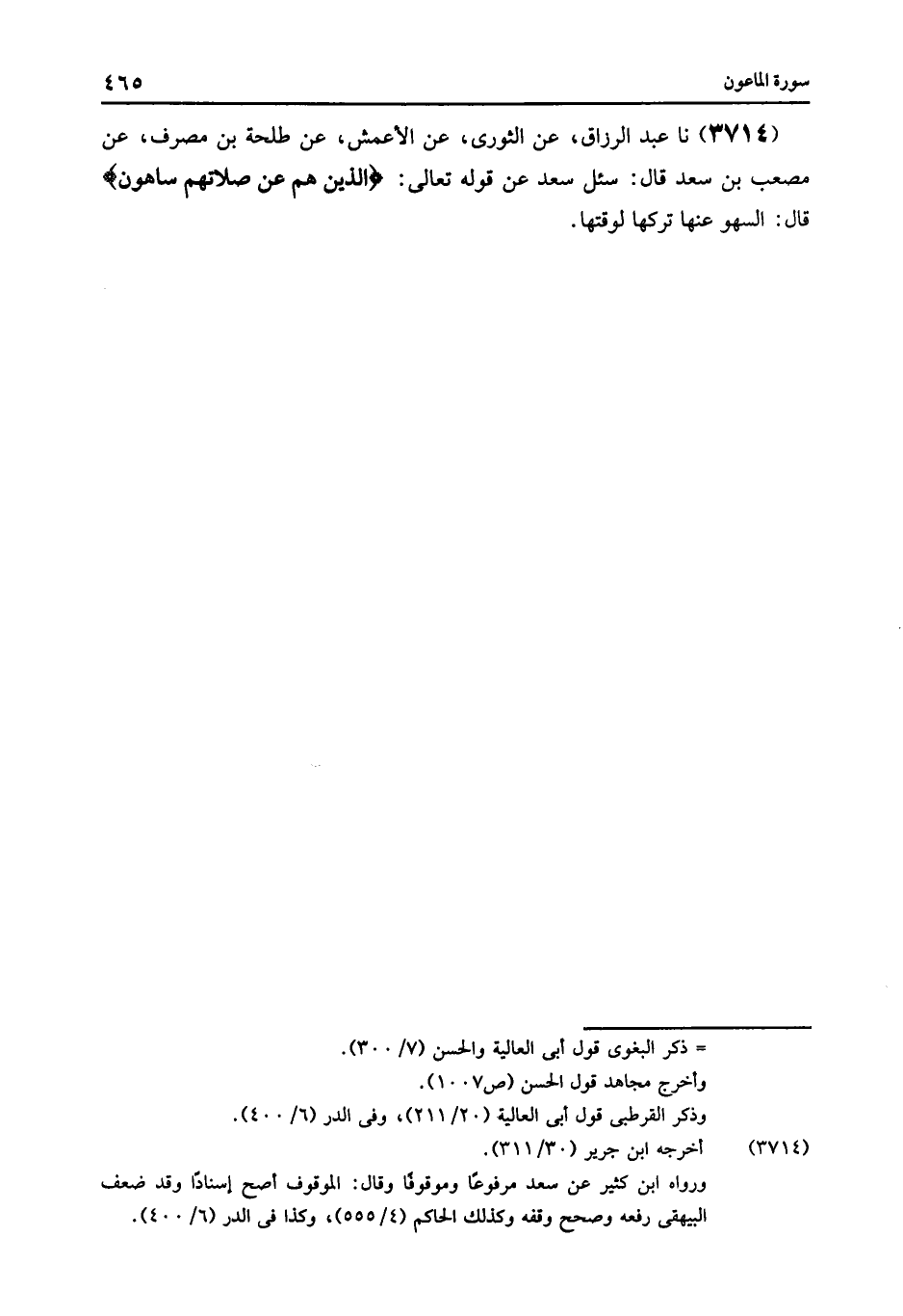 3714 - عَنِ الثَّوْرِيِّ , عَنِ الْأَعْمَشِ , عَنْ طَلْحَةَ بْنِ مُصَرِّفٍ , عَنْ مُصْعَبِ بْنِ سَعْدٍ , قَالَ: سُئِلَ سَعْدٌ , عَنْ قَوْلِهِ تَعَالَى {الَّذِينَ هُمْ عَنْ صَلَاتِهِمْ سَاهُونَ} [الماعون: 5] قَالَ: «§السَّهْوُ عَنْهَا تَرْكُهَا لِوَقْتِهَا»