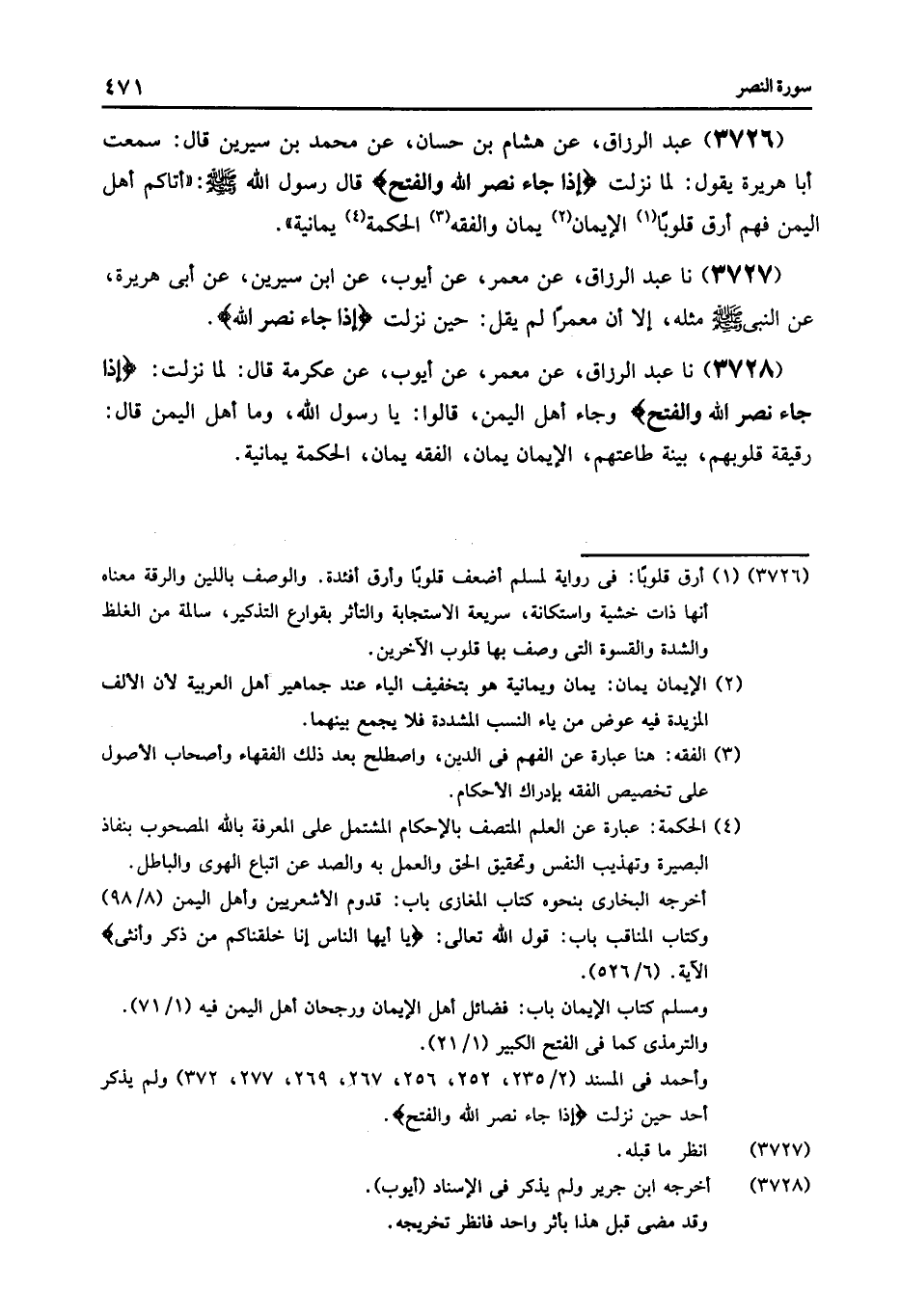 3726 - عَنْ هِشَامِ بْنِ حَسَّانَ , عَنْ مُحَمَّدِ بْنِ سِيرِينَ , قَالَ: سَمِعْتُ أَبَا هُرَيْرَةَ , يَقُولُ: لَمَّا نَزَلَتْ {إِذَا جَاءَ نَصْرُ اللَّهِ وَالْفَتْحِ} [النصر: 1] قَالَ رَسُولُ اللَّهِ صَلَّى اللهُ عَلَيْهِ وَسَلَّمَ: «§أَتَاكُمْ أَهْلُ الْيَمَنِ فَهُمْ أَرَقُّ قُلُوبًا الْإِيمَانُ يَمَانٍ , والْفِقْهُ يَمَانٍ , الْحِكْمَةُ يَمَانِيَةٌ» نا عَبْدُ الرَّزَّاقِ