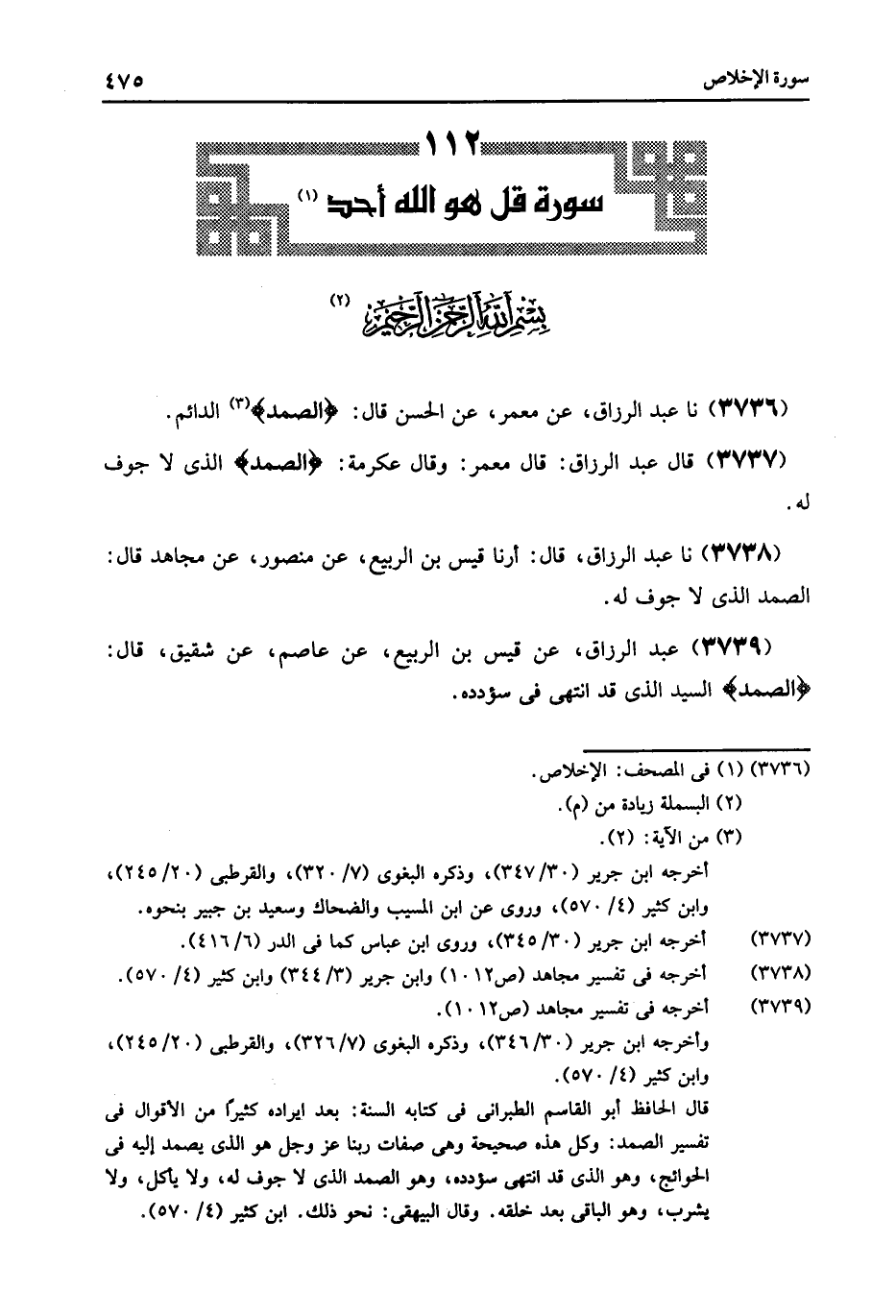 3737 - قَالَ عَبْدُ الرَّزَّاقِ قَالَ مَعْمَرٌ: وَقَالَ عِكْرِمَةُ {الصَّمَدُ} [الإخلاص: 2] : «§الَّذِي لَا جَوْفَ لَهُ»