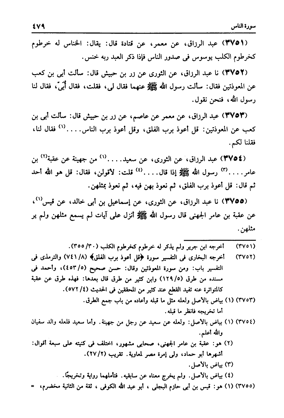3753 - عَنْ مَعْمَرٍ , عَنْ عَاصِمٍ , عَنْ زِرِّ بْنِ حُبَيْشٍ , قَالَ: سَأَلْتُ أُبَيَّ بْنَ كَعْبٍ عَنِ الْمُعَوِّذَتَيْنِ , {§قُلْ أَعُوذُ بِرَبِّ الْفَلَقِ} [الفلق: 1] , وَ {قُلْ أَعُوذُ بِرَبِّ النَّاسِ} [الناس: 1] فَقَالَ لَنَا فَقُلْنَا لَكُمْ
