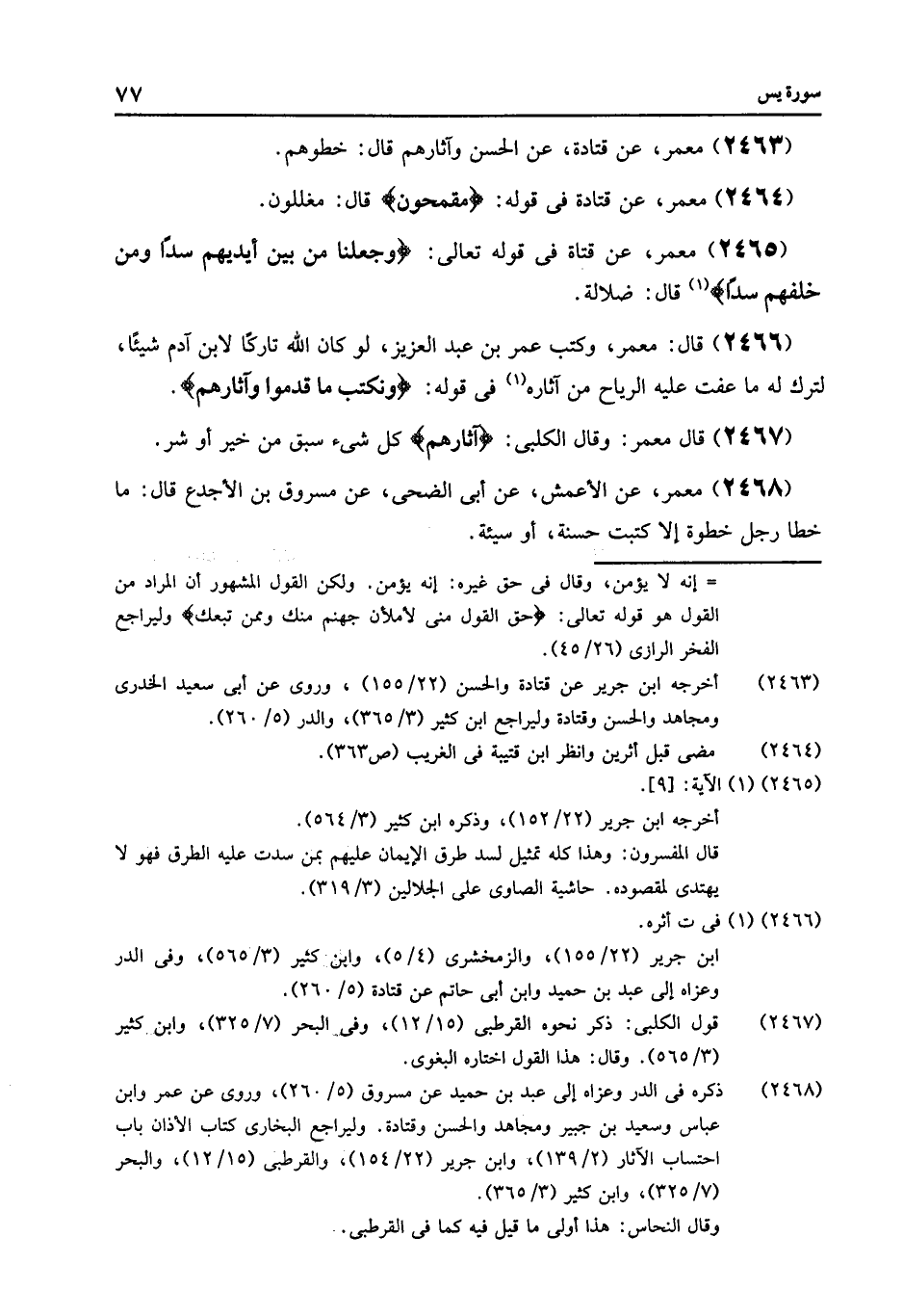 2465 - مَعْمَرٌ , عَنْ قَتَادَةَ , فِي قَوْلِهِ تَعَالَى: {§وَجَعَلْنَا مِنْ بَيْنِ أَيْدِيهِمْ سَدًّا وَمِنْ خَلْفِهِمْ سَدًّا} [يس: 9] قَالَ: «ضَلَالَةً»