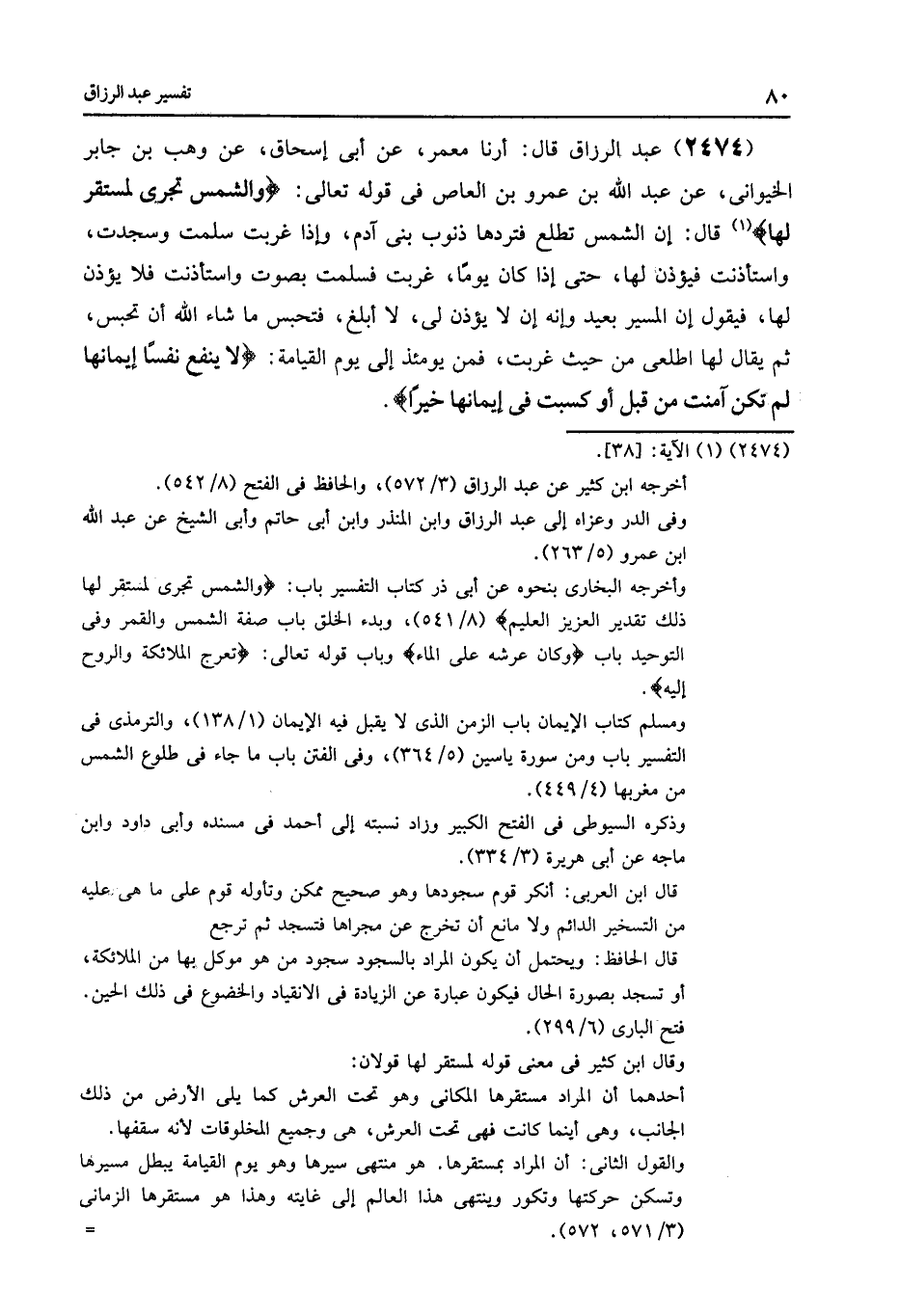 2474 - عَبْدُ الرَّزَّاقِ قال: أرنا مَعْمَرٌ , عَنْ أَبِي إِسْحَاقَ , عَنْ وَهْبِ بْنِ جَابِرٍ الْخَيْوَانِيِّ , عَنْ عَبْدِ اللَّهِ بْنِ عَمْرِو بْنِ الْعَاصِ , فِي قَوْلِهِ تَعَالَى: {وَالشَّمْسُ تَجْرِي لِمُسْتَقَرٍّ لَهَا} [يس: 38] قَالَ: إِنَّ الشَّمْسَ تَطْلُعُ فَتَرُدُّهَا ذُنُوبُ بَنِي آدَمَ , وَإِذَا غَرَبَتْ سَلَّمَتْ وَسَجَدَتْ وَاسْتَأْذَنَتْ , فَيُؤْذَنُ لَهَا حَتَّى إِذَا كَانَ يَوْمًا غَرَبَتْ فَسَلَّمَتْ بِصَوْتٍ وَاسْتَأْذَنَتْ فَلَا يُؤْذَنُ لَهَا , فَيَقُولُ: إِنَّ الْمَسِيرَ بَعِيدٌ وَإِنَّهُ إِنْ لَا يُؤْذَنُ لِي لَا أَبْلُغُ , فَتُحْبَسُ مَا شَاءَ اللَّهُ أَنْ تُحْبَسَ , ثُمَّ يُقَالُ لَهَا: " §اطْلُعِي مِنْ حَيْثُ غَرَبْتِ , فَمِنْ يَوْمِئِذٍ إِلَى يَوْمِ الْقِيَامَةِ: {لَا يَنْفَعُ نَفْسًا إِيمَانُهَا لَمْ تَكُنْ آمَنَتْ مِنْ قَبْلُ أَوْ كَسَبَتْ فِي إِيمَانِهَا خَيْرًا} [الأنعام: 158]