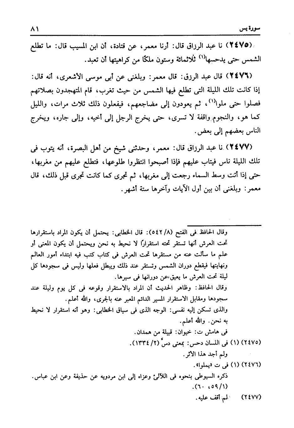 2477 - قَالَ مَعْمَرٌ: وَحَدَّثَنِي شَيْخٌ مِنْ أَهْلِ الْبَصْرَةِ: «أَنَّهُ §يَتُوبُ فِي تِلْكَ اللَّيْلَةِ نَاسٌ فَيُتَابُ عَلَيْهِمْ , فَإِذَا أَصْبَحُوا انْتَظَرُوا طُلُوعَهَا فَتَطْلُعُ عَلَيْهِمْ مِنْ مَغْرِبِهَا حَتَّى إِذَا أَتَتْ وَسَطَ السَّمَاءِ رَجَعَتْ إِلَى مَغْرِبِهَا , ثُمَّ تَجْرِي كَمَا كَانَتْ تَجْرِي قَبْلَ ذَلِكَ» قَالَ مَعْمَرٌ: «وَبَلَغَنِي أَنَّ بَيْنَ أَوَّلِ الْآيَاتِ وَآخِرِهَا سِتَّةُ أَشْهُرٍ»