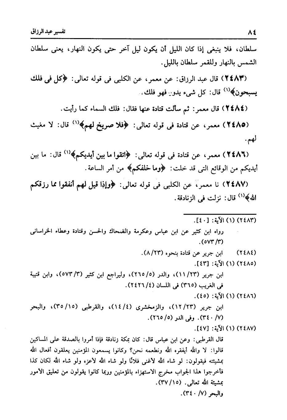 2487 - نا مَعْمَرٌ , عَنِ الْكَلْبِيِّ , فِي قَوْلِهِ تَعَالَى: {وَإِذَا قِيلَ لَهُمْ أَنْفِقُوا مِمَّا رَزَقَكُمُ اللَّهُ} [يس: 47] قَالَ: «§نَزَلَتْ فِي الزَّنَادِقَةِ»