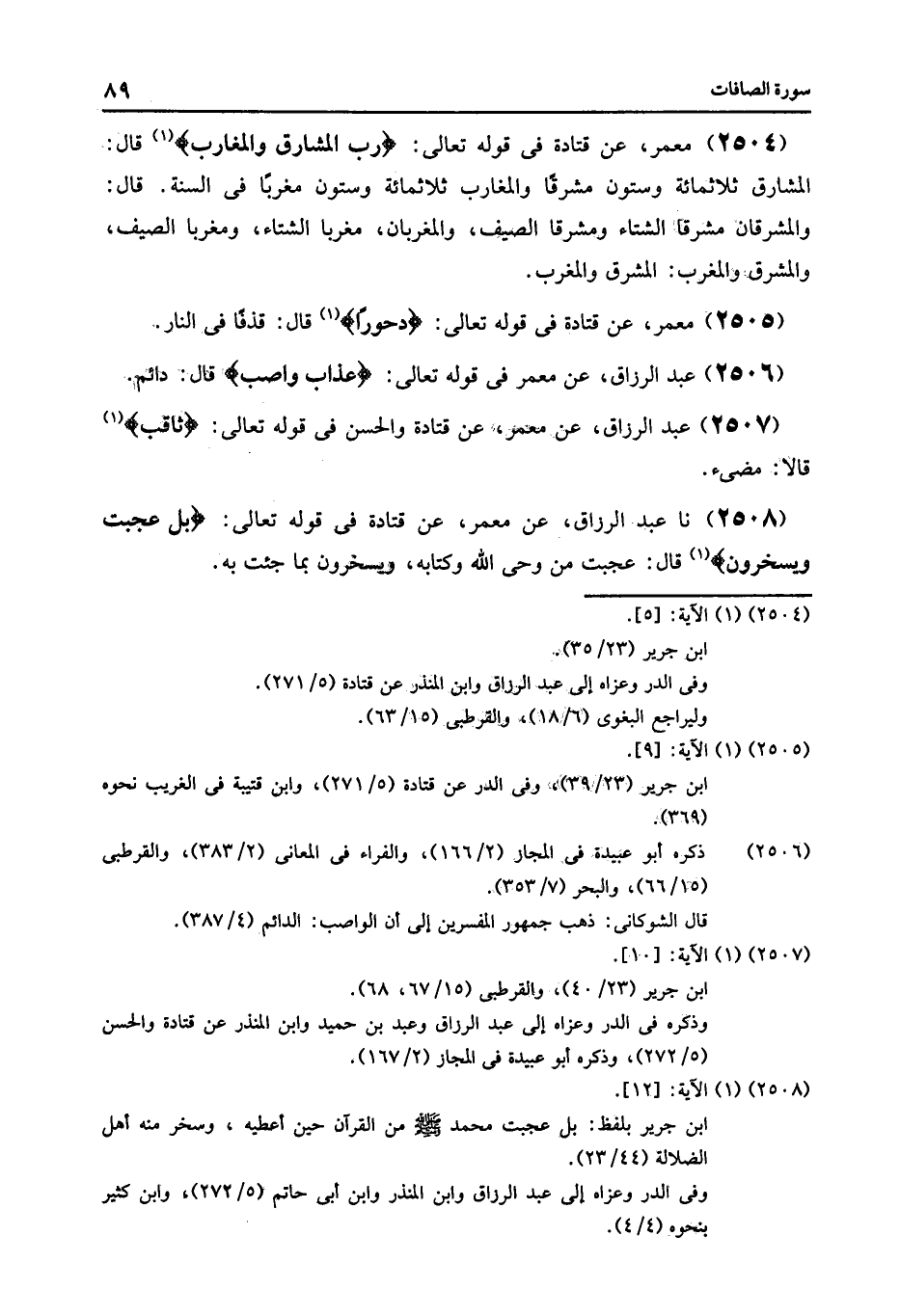 2508 - عَنْ مَعْمَرٍ , عَنْ قَتَادَةَ , فِي قَوْلِهِ تَعَالَى: {بَلْ عَجِبْتَ وَيَسْخَرُونَ} [الصافات: 12] قَالَ: «§عَجِبْتَ مِنْ وَحْيِ اللَّهِ وَكِتَابِهِ وَيَسْخَرُونَ بِمَا جِئْتَ بِهِ»