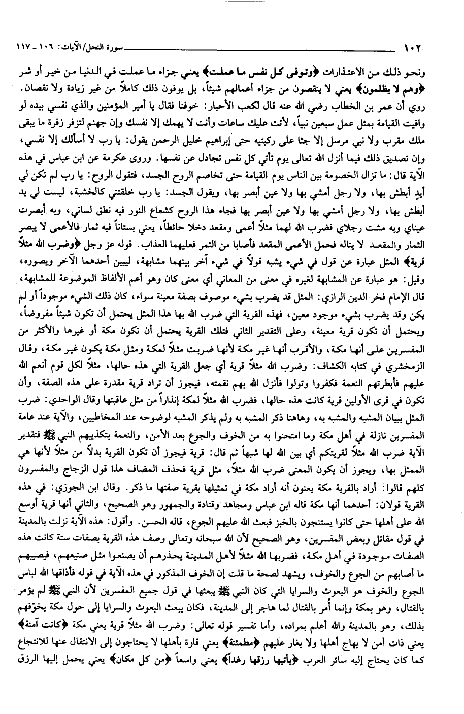 روي أن عمر بن الخطاب رضي الله عنه قال لكعب الأحبار: خوفنا فقال يا أمير المؤمنين والذي نفسي بيده لو وافيت القيامة بمثل عمل سبعين نبيا، لأتت عليك ساعات وأنت لا يهمك إلا نفسك وإن جهنم لتزفر زفرة ما يبقى ملك مقرب ولا نبي مرسل إلا جثا على ركبتيه حتى إبراهيم خليل الرحمن يقول: يا رب لا أسألك إلا نفسي، وإن تصديق ذلك فيما أنزل الله تعالى يوم تأتي كل نفس تجادل عن نفسها. وروى عكرمة عن ابن عباس في هذه الآية قال: ما تزال الخصومة بين الناس يوم القيامة حتى تخاصم الروح الجسد، فتقول الروح: يا رب لم تكن لي أيد أبطش بها، ولا رجل أمشي بها ولا عين أبصر بها، ويقول الجسد: يا رب خلقتني كالخشبة، ليست لي يد أبطش بها، ولا رجل أمشي بها ولا عين أبصر بها فجاء هذا الروح كشعاع النور فيه نطق لساني، وبه أبصرت عيناي وبه مشت رجلاي فضرب الله لهما مثلا أعمى ومقعد دخلا حائطا، يعني بستانا فيه ثمار فالأعمى لا يبصر الثمار والمقعد لا يناله فحمل الأعمى المقعد فأصابا من الثمر فعليهما العذاب. قوله عز وجل وَضَرَبَ اللَّهُ مَثَلًا قَرْيَةً المثل عبارة عن قول في شيء يشبه قولا في شيء آخر بينهما مشابهة، ليبين أحدهما الآخر ويصوره، وقيل: هو عبارة عن المشابهة لغيره في معنى من المعاني أي معنى كان وهو أعم الألفاظ الموضوعة للمشابهة، قال الإمام فخر الدين الرازي: المثل قد يضرب بشيء موصوف بصفة معينة سواء، كان ذلك الشيء موجودا أو لم يكن وقد يضرب بشيء موجود معين، فهذه القرية التي ضرب الله بها هذا المثل يحتمل أن تكون شيئا مفروضا، ويحتمل أن تكون قرية معينة، وعلى التقدير الثاني فتلك القرية يحتمل أن تكون مكة أو غيرها والأكثر من المفسرين على أنها مكة، والأقرب أنها غير مكة لأنها ضربت مثلا لمكة ومثل مكة يكون غير مكة، وقال الزمخشري في كتابه الكشاف: وضرب الله مثلا قرية أي جعل القرية التي هذه حالها، مثلا لكل قوم أنعم الله عليهم فأبطرتهم النعمة فكفروا وتولوا فأنزل الله بهم نقمته، فيجوز أن تراد قرية مقدرة على هذه الصفة، وأن تكون في قرى الأولين قرية كانت هذه حالها، فضرب الله مثلا لمكة إنذارا من مثل عاقبتها وقال الواحدي: ضرب المثل ببيان المشبه والمشبه به، وهاهنا ذكر المشبه به ولم يذكر المشبه لوضوحه عند المخاطبين، والآية عند عامة المفسرين نازلة في أهل مكة وما امتحنوا به من الخوف والجوع بعد الأمن، والنعمة بتكذيبهم النبي صلّى الله عليه وسلّم فتقدير الآية ضرب الله مثلا لقريتكم أي بين الله لها شبها ثم قال: قرية فيجوز أن تكون القرية بدلا من مثلا لأنها هي الممثل بها، ويجوز أن يكون المعنى ضرب الله مثلا، مثل قرية فحذف المضاف هذا قول الزجاج والمفسرون كلهم قالوا: أراد بالقرية مكة يعنون أنه أراد مكة في تمثيلها بقرية صفتها ما ذكر. وقال ابن الجوزي: في هذه القرية قولان: أحدهما أنها مكة قاله ابن عباس ومجاهد وقتادة والجمهور وهو الصحيح، والثاني أنها قرية أوسع الله على أهلها حتى كانوا يستنجون بالخبز فبعث الله عليهم الجوع، قاله الحسن. وأقول: هذه الآية نزلت بالمدينة في قول مقاتل وبعض المفسرين، وهو الصحيح لأن الله سبحانه وتعالى وصف هذه القرية بصفات ستة كانت هذه الصفات موجودة في أهل مكة، فضربها الله مثلا لأهل المدينة يحذرهم أن يصنعوا مثل صنيعهم، فيصيبهم ما أصابهم من الجوع والخوف، ويشهد لصحة ما قلت إن الخوف المذكور في هذه الآية في قوله فأذاقها الله لباس الجوع والخوف هو البعوث والسرايا التي كان النبي صلّى الله عليه وسلّم يبعثها في قول جميع المفسرين لأن النبي صلّى الله عليه وسلّم لم يؤمر بالقتال، وهو بمكة وإنما أمر بالقتال لما هاجر إلى المدينة، فكان يبعث البعوث والسرايا إلى حول مكة يخوّفهم بذلك، وهو بالمدينة والله أعلم بمراده، وأما تفسير قوله تعالى: وضرب الله مثلا قرية يعني مكة كانَتْ آمِنَةً يعني ذات أمن لا يهاج أهلها ولا يغار عليهم مُطْمَئِنَّةً يعني قارة بأهلها لا يحتاجون إلى الانتقال عنها للانتجاع كما كان يحتاج إليه سائر العرب يَأْتِيها رِزْقُها رَغَداً ي