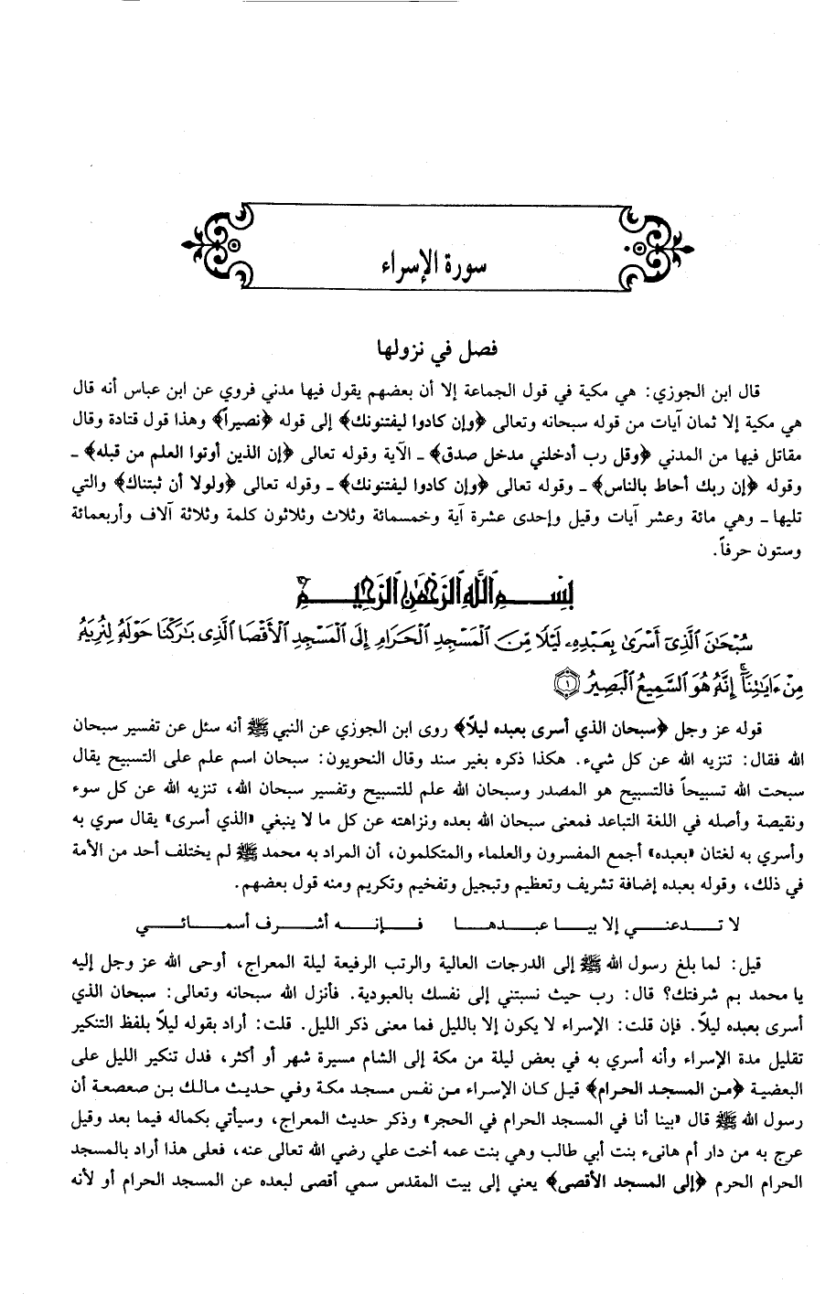 سُبْحانَ الَّذِي أَسْرى بِعَبْدِهِ لَيْلاً مِنَ الْمَسْجِدِ الْحَرامِ إِلَى الْمَسْجِدِ الْأَقْصَى الَّذِي بارَكْنا حَوْلَهُ لِنُرِيَهُ مِنْ آياتِنا إِنَّهُ هُوَ السَّمِيعُ الْبَصِيرُ (1)