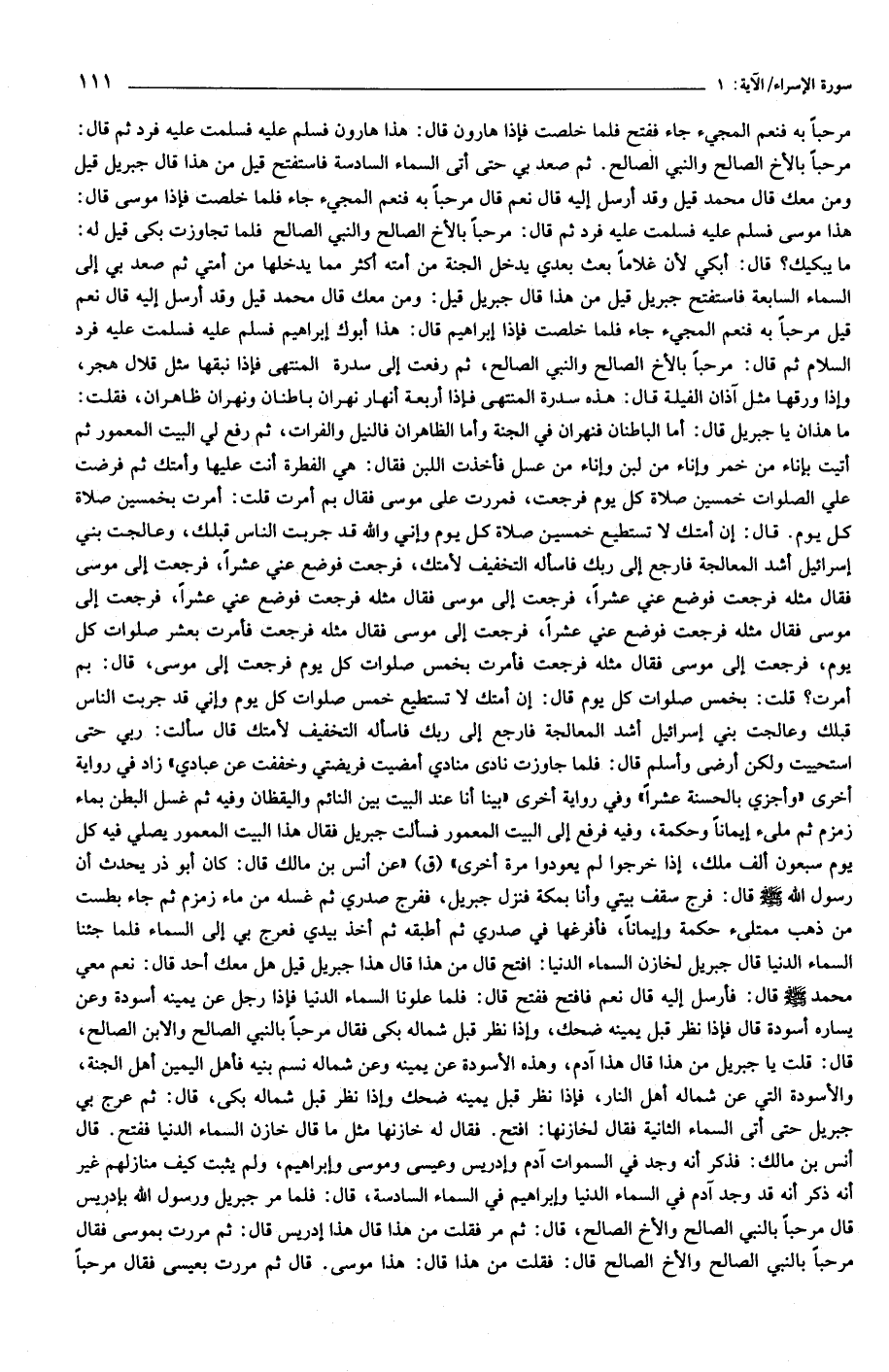 ما هذان يا جبريل قال: أما الباطنان فنهران في الجنة وأما الظاهران فالنيل والفرات، ثم رفع لي البيت المعمور ثم أتيت بإناء من خمر وإناء من لبن وإناء من عسل فأخذت اللبن فقال: هي الفطرة أنت عليها وأمتك ثم فرضت علي الصلوات خمسين صلاة كل يوم فرجعت، فمررت على موسى فقال بم أمرت قلت: أمرت بخمسين صلاة كل يوم. قال: إن أمتك لا تستطيع خمسين صلاة كل يوم وإني والله قد جربت الناس قبلك، وعالجت بني إسرائيل أشد المعالجة فارجع إلى ربك فاسأله التخفيف لأمتك، فرجعت فوضع عني عشرا، فرجعت إلى موسى فقال مثله فرجعت فوضع عني عشرا، فرجعت إلى موسى فقال مثله فرجعت فوضع عني عشرا، فرجعت إلى موسى فقال مثله فرجعت فوضع عني عشرا، فرجعت إلى موسى فقال مثله فرجعت فأمرت بعشر صلوات كل يوم، فرجعت إلى موسى فقال مثله فرجعت فأمرت بخمس صلوات كل يوم فرجعت إلى موسى، قال: بم أمرت؟ قلت: بخمس صلوات كل يوم قال: إن أمتك لا تستطيع خمس صلوات كل يوم وإني قد جربت الناس قبلك وعالجت بني إسرائيل أشد المعالجة فارجع إلى ربك فاسأله التخفيف لأمتك قال سألت: ربي حتى استحييت ولكن أرضى وأسلم قال: فلما جاوزت نادى منادي أمضيت فريضتي وخففت عن عبادي» زاد في رواية أخرى «وأجزي بالحسنة عشرا» وفي رواية أخرى «بينا أنا عند البيت بين النائم واليقظان وفيه ثم غسل البطن بماء زمزم ثم ملئ إيمانا وحكمة، وفيه فرفع إلى البيت المعمور فسألت جبريل فقال هذا البيت المعمور يصلي فيه كل يوم سبعون ألف ملك، إذا خرجوا لم يعودوا مرة أخرى» (ق) «عن أنس بن مالك قال: كان أبو ذر يحدث أن رسول الله صلّى الله عليه وسلّم قال: فرج سقف بيتي وأنا بمكة فنزل جبريل، ففرج صدري ثم غسله من ماء زمزم ثم جاء بطست من ذهب ممتلئ حكمة وإيمانا، فأفرغها في صدري ثم أطبقه ثم أخذ بيدي فعرج بي إلى السماء فلما جئنا السماء الدنيا قال جبريل لخازن السماء الدنيا: افتح قال من هذا قال هذا جبريل قيل هل معك أحد قال: نعم معي محمد صلّى الله عليه وسلّم قال: فأرسل إليه قال نعم فافتح ففتح قال: فلما علونا السماء الدنيا فإذا رجل عن يمينه أسودة وعن يساره أسودة قال فإذا نظر قبل يمينه ضحك، وإذا نظر قبل شماله بكى فقال مرحبا بالنبي الصالح والابن الصالح، قال: قلت يا جبريل من هذا قال هذا آدم، وهذه الأسودة عن يمينه وعن شماله نسم بنيه فأهل اليمين أهل الجنة، والأسودة التي عن شماله أهل النار، فإذا نظر قبل يمينه ضحك وإذا نظر قبل شماله بكى، قال: ثم عرج بي جبريل حتى أتى السماء الثانية فقال لخازنها: افتح. فقال له خازنها مثل ما قال خازن السماء الدنيا ففتح. قال أنس بن مالك: فذكر أنه وجد في السموات آدم وإدريس وعيسى وموسى وإبراهيم، ولم يثبت كيف منازلهم غير أنه ذكر أنه قد وجد آدم في السماء الدنيا وإبراهيم في السماء السادسة، قال: فلما مر جبريل ورسول الله بإدريس قال مرحبا بالنبي الصالح والأخ الصالح، قال: ثم مر فقلت من هذا قال هذا إدريس قال: ثم مررت بموسى فقال مرحبا بالنبي الصالح والأخ الصالح قال: فقلت من هذا قال: هذا موسى. قال ثم مررت بعيسى فقال مرحبا