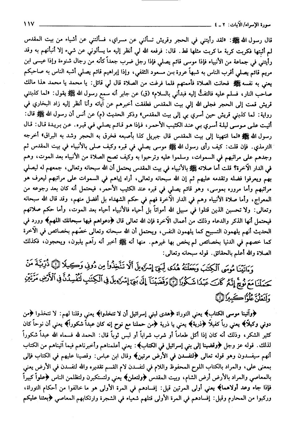 وَآتَيْنا مُوسَى الْكِتابَ وَجَعَلْناهُ هُدىً لِبَنِي إِسْرائِيلَ أَلاَّ تَتَّخِذُوا مِنْ دُونِي وَكِيلاً (2) ذُرِّيَّةَ مَنْ حَمَلْنا مَعَ نُوحٍ إِنَّهُ كانَ عَبْداً شَكُوراً (3) وَقَضَيْنا إِلى بَنِي إِسْرائِيلَ فِي الْكِتابِ لَتُفْسِدُنَّ فِي الْأَرْضِ مَرَّتَيْنِ وَلَتَعْلُنَّ عُلُوًّا كَبِيراً (4)