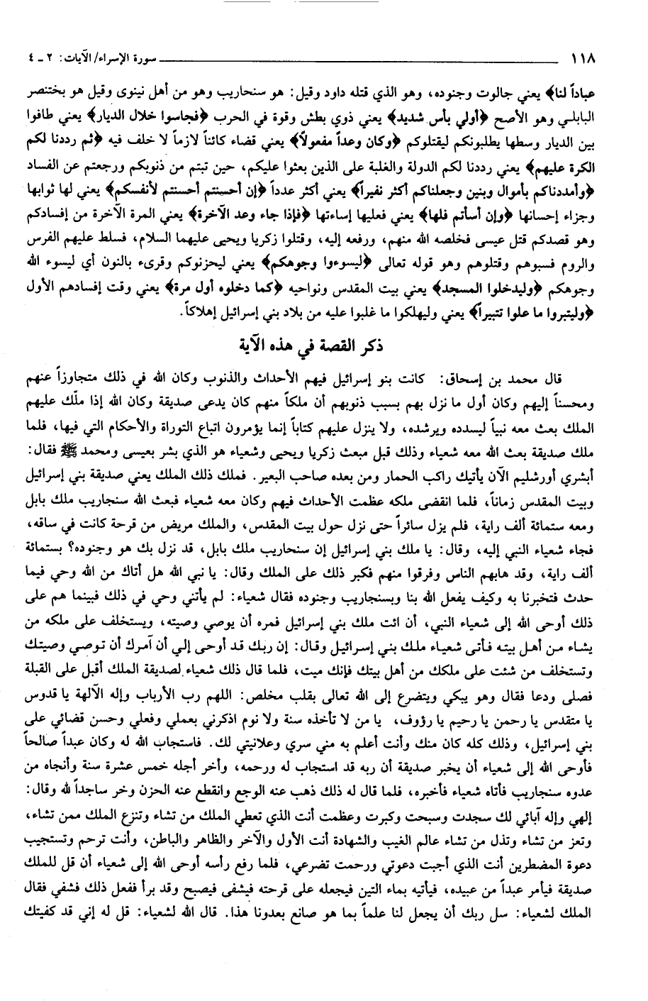 بَعَثْنا عَلَيْكُمْ عِباداً لَنا يعني جالوت وجنوده، وهو الذي قتله داود وقيل: هو سنحاريب وهو من أهل نينوى وقيل هو بختنصر البابلي وهو الأصح أُولِي بَأْسٍ شَدِيدٍ يعني ذوي بطش وقوة في الحرب فَجاسُوا خِلالَ الدِّيارِ يعني طافوا بين الديار وسطها يطلبونكم ليقتلوكم وَكانَ وَعْداً مَفْعُولًا يعني قضاء كائنا لازما لا خلف فيه ثُمَّ رَدَدْنا لَكُمُ الْكَرَّةَ عَلَيْهِمْ يعني رددنا لكم الدولة والغلبة على الذين بعثوا عليكم، حين تبتم من ذنوبكم ورجعتم عن الفساد وَأَمْدَدْناكُمْ بِأَمْوالٍ وَبَنِينَ وَجَعَلْناكُمْ أَكْثَرَ نَفِيراً يعني أكثر عددا إِنْ أَحْسَنْتُمْ أَحْسَنْتُمْ لِأَنْفُسِكُمْ يعني لها ثوابها وجزاء إحسانها وَإِنْ أَسَأْتُمْ فَلَها يعني فعليها إساءتها فَإِذا جاءَ وَعْدُ الْآخِرَةِ يعني المرة الآخرة من إفسادكم وهو قصدكم قتل عيسى فخلصه الله منهم، ورفعه إليه، وقتلوا زكريا ويحيى عليهما السلام، فسلط عليهم الفرس والروم فسبوهم وقتلوهم وهو قوله تعالى لِيَسُوؤُا وُجُوهَكُمْ يعني ليحزنوكم وقرئ بالنون أي ليسوء الله وجوهكم وَلِيَدْخُلُوا الْمَسْجِدَ يعني بيت المقدس ونواحيه كَما دَخَلُوهُ أَوَّلَ مَرَّةٍ يعني وقت إفسادهم الأول وَلِيُتَبِّرُوا ما عَلَوْا تَتْبِيراً يعني وليهلكوا ما غلبوا عليه من بلاد بني إسرائيل إهلاكا.