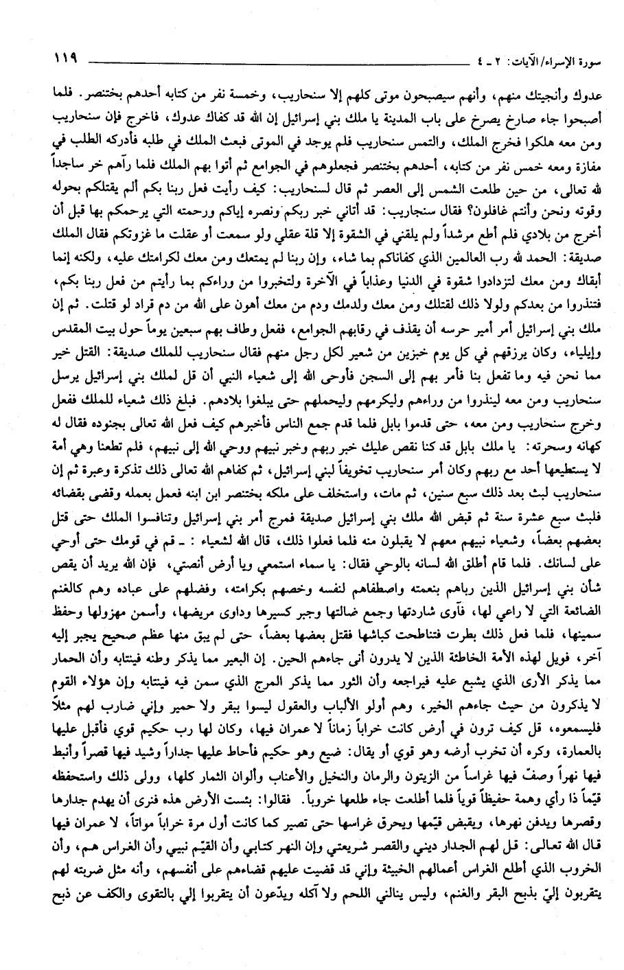 عدوك وأنجيتك منهم، وأنهم سيصبحون موتى كلهم إلا سنحاريب، وخمسة نفر من كتابه أحدهم بختنصر. فلما أصبحوا جاء صارخ يصرخ على باب المدينة يا ملك بني إسرائيل إن الله قد كفاك عدوك، فاخرج فإن سنحاريب ومن معه هلكوا فخرج الملك، والتمس سنحاريب فلم يوجد في الموتى فبعث الملك في طلبه فأدركه الطلب في مفازة ومعه خمس نفر من كتابه، أحدهم بختنصر فجعلوهم في الجوامع ثم أتوا بهم الملك فلما رآهم خر ساجدا لله تعالى، من حين طلعت الشمس إلى العصر ثم قال لسنحاريب: كيف رأيت فعل ربنا بكم ألم يقتلكم بحوله وقوته ونحن وأنتم غافلون؟ فقال سنجاريب: قد أتاني خبر ربكم ونصره إياكم ورحمته التي يرحمكم بها قبل أن أخرج من بلادي فلم أطع مرشدا ولم يلقني في الشقوة إلا قلة عقلي ولو سمعت أو عقلت ما غزوتكم فقال الملك صديقة: الحمد لله رب العالمين الذي كفاناكم بما شاء، وإن ربنا لم يمتعك ومن معك لكرامتك عليه، ولكنه إنما أبقاك ومن معك لتزدادوا شقوة في الدنيا وعذابا في الآخرة ولتخبروا من وراءكم بما رأيتم من فعل ربنا بكم، فتنذروا من بعدكم ولولا ذلك لقتلك ومن معك ولدمك ودم من معك أهون على الله من دم قراد لو قتلت. ثم إن ملك بني إسرائيل أمر أمير حرسه أن يقذف في رقابهم الجوامع، ففعل وطاف بهم سبعين يوما حول بيت المقدس وإيلياء، وكان يرزقهم في كل يوم خبزين من شعير لكل رجل منهم فقال سنحاريب للملك صديقة: القتل خير مما نحن فيه وما تفعل بنا فأمر بهم إلى السجن فأوحى الله إلى شعياء النبي أن قل لملك بني إسرائيل يرسل سنحاريب ومن معه لينذروا من وراءهم وليكرمهم وليحملهم حتى يبلغوا بلادهم. فبلغ ذلك شعياء للملك ففعل وخرج سنحاريب ومن معه، حتى قدموا بابل فلما قدم جمع الناس فأخبرهم كيف فعل الله تعالى بجنوده فقال له كهانه وسحرته: يا ملك بابل قد كنا نقص عليك خبر ربهم وخبر نبيهم ووحي الله إلى نبيهم، فلم تطعنا وهي أمة لا يستطيعها أحد مع ربهم وكان أمر سنحاريب تخويفا لبني إسرائيل، ثم كفاهم الله تعالى ذلك تذكرة وعبرة ثم إن سنحاريب لبث بعد ذلك سبع سنين، ثم مات، واستخلف على ملكه بختنصر ابن ابنه فعمل بعمله وقضى بقضائه فلبث سبع عشرة سنة ثم قبض الله ملك بني إسرائيل صديقة فمرج أمر بني إسرائيل وتنافسوا الملك حتى قتل بعضهم بعضا، وشعياء نبيهم معهم لا يقبلون منه فلما فعلوا ذلك، قال الله لشعياء: - قم في قومك حتى أوحي على لسانك. فلما قام أطلق الله لسانه بالوحي فقال: يا سماء استمعي ويا أرض أنصتي، فإن الله يريد أن يقص شأن بني إسرائيل الذين رباهم بنعمته واصطفاهم لنفسه وخصهم بكرامته، وفضلهم على عباده وهم كالغنم الضائعة التي لا راعي لها، فآوى شاردتها وجمع ضالتها وجبر كسيرها وداوى مريضها، وأسمن مهزولها وحفظ سمينها، فلما فعل ذلك بطرت فتناطحت كباشها فقتل بعضها بعضا، حتى لم يبق منها عظم صحيح يجبر إليه آخر، فويل لهذه الأمة الخاطئة الذين لا يدرون أنى جاءهم الحين. إن البعير مما يذكر وطنه فينتابه وأن الحمار مما يذكر الأرى الذي يشبع عليه فيراجعه وأن الثور مما يذكر المرج الذي سمن فيه فينتابه وإن هؤلاء القوم لا يذكرون من حيث جاءهم الخير، وهم أولوا الألباب والعقول ليسوا ببقر ولا حمير وإني ضارب لهم مثلا فليسمعوه، قل كيف ترون في أرض كانت خرابا زمانا لا عمران فيها، وكان لها رب حكيم قوي فأقبل عليها بالعمارة، وكره أن تخرب أرضه