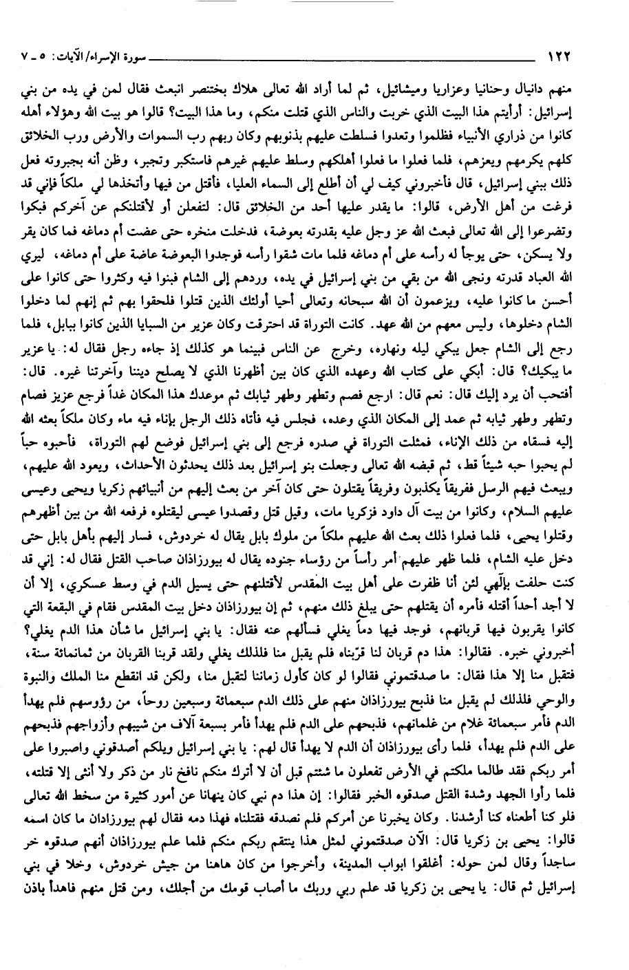 أخبروني خبره. فقالوا: هذا دم قربان لنا قرّبناه فلم يقبل منا فلذلك يغلي ولقد قربنا القربان من ثمانمائة سنة، فتقبل منا إلا هذا فقال: ما صدقتموني فقالوا لو كان كأول زماننا لتقبل منا، ولكن قد انقطع منا الملك والنبوة والوحي فلذلك لم يقبل منا فذبح بيورزاذان منهم على ذلك الدم سبعمائة وسبعين روحا، من رؤوسهم فلم يهدأ الدم فأمر سبعمائة غلام من غلمانهم، فذبحهم على الدم فلم يهدأ فأمر بسبعة آلاف من شيبهم وأزواجهم فذبحهم على الدم فلم يهدأ، فلما رأى بيورزاذان أن الدم لا يهدأ قال لهم: يا بني إسرائيل ويلكم اصدقوني واصبروا على أمر ربكم فقد طالما ملكتم في الأرض تفعلون ما شئتم قبل أن لا أترك منكم نافخ نار من ذكر ولا أنثى إلا قتلته، فلما رأوا الجهد وشدة القتل صدقوه الخبر فقالوا: إن هذا دم نبي كان ينهانا عن أمور كثيرة من سخط الله تعالى فلو كنا أطعناه كنا أرشدنا. وكان يخبرنا عن أمركم فلم نصدقه فقتلناه فهذا دمه فقال لهم بيورزاذان ما كان اسمه قالوا: يحيى بن زكريا قال: الآن صدقتموني لمثل هذا ينتقم ربكم منكم فلما علم بيورزاذان أنهم صدقوه خر ساجدا وقال لمن حوله: أغلقوا أبواب المدينة، وأخرجوا من كان هاهنا من جيش خردوش، وخلا في بني إسرائيل ثم قال: يا يحيى بن زكريا قد علم ربي وربك ما أصاب قومك من أجلك، ومن قتل منهم فاهدأ باذن