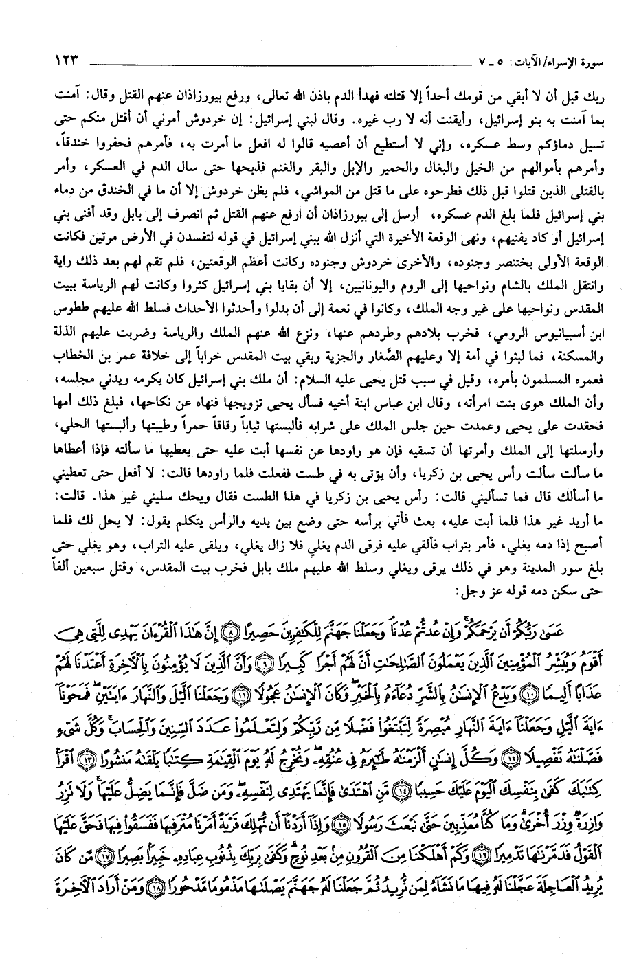 ربك قبل أن لا أبقي من قومك أحدا إلا قتلته فهدأ الدم باذن الله تعالى، ورفع بيورزاذان عنهم القتل وقال: آمنت بما آمنت به بنو إسرائيل، وأيقنت أنه لا رب غيره. وقال لبني إسرائيل: إن خردوش أمرني أن أقتل منكم حتى تسيل دماؤكم وسط عسكره، وإني لا أستطيع أن أعصيه قالوا له افعل ما أمرت به، فأمرهم فحفروا خندقا، وأمرهم بأموالهم من الخيل والبغال والحمير والإبل والبقر والغنم فذبحها حتى سال الدم في العسكر، وأمر بالقتلى الذين قتلوا قبل ذلك فطرحوه على ما قتل من المواشي، فلم يظن خردوش إلا أن ما في الخندق من دماء بني إسرائيل فلما بلغ الدم عسكره، أرسل إلى بيورزاذان أن ارفع عنهم القتل ثم انصرف إلى بابل وقد أفنى بني إسرائيل أو كاد يفنيهم، ونهى الوقعة الأخيرة التي أنزل الله ببني إسرائيل في قوله لتفسدن في الأرض مرتين فكانت الوقعة الأولى بختنصر وجنوده، والأخرى خردوش وجنوده وكانت أعظم الوقعتين، فلم تقم لهم بعد ذلك راية وانتقل الملك بالشام ونواحيها إلى الروم واليونانيين، إلا أن بقايا بني إسرائيل كثروا وكانت لهم الرياسة ببيت المقدس ونواحيها على غير وجه الملك، وكانوا في نعمة إلى أن بدلوا وأحدثوا الأحداث فسلط الله عليهم ططوس ابن أسبيانيوس الرومي، فخرب بلادهم وطردهم عنها، ونزع الله عنهم الملك والرياسة وضربت عليهم الذلة والمسكنة، فما لبثوا في أمة إلا وعليهم الصّغار والجزية وبقي بيت المقدس خرابا إلى خلافة عمر بن الخطاب فعمره المسلمون بأمره، وقيل في سبب قتل يحيى عليه السلام: أن ملك بني إسرائيل كان يكرمه ويدني مجلسه، وأن الملك هوى بنت امرأته، وقال ابن عباس ابنة أخيه فسأل يحيى تزويجها فنهاه عن نكاحها، فبلغ ذلك أمها فحقدت على يحيى وعمدت حين جلس الملك على شرابه فألبستها ثيابا رقاقا حمرا وطيبتها وألبستها الحلي، وأرسلتها إلى الملك وأمرتها أن تسقيه فإن هو راودها عن نفسها أبت عليه حتى يعطيها ما سألته فإذا أعطاها ما سألت سألت رأس يحيى بن زكريا، وأن يؤتى به في طست ففعلت فلما راودها قالت: لا أفعل حتى تعطيني ما أسألك قال فما تسأليني قالت: رأس يحيى بن زكريا في هذا الطست فقال ويحك سليني غير هذا. قالت: