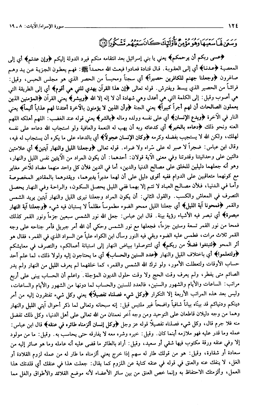 فراشا من الحصير الذي يبسط ويفترش. قوله تعالى إِنَّ هذَا الْقُرْآنَ يَهْدِي لِلَّتِي هِيَ أَقْوَمُ أي إلى الطريقة التي هي أصوب وقيل: إلى الكلمة التي هي أعدل وهي شهادة أن لا إله إلا الله وَيُبَشِّرُ يعني القرآن الْمُؤْمِنِينَ الَّذِينَ يَعْمَلُونَ الصَّالِحاتِ أَنَّ لَهُمْ أَجْراً كَبِيراً يعني الجنة وَأَنَّ الَّذِينَ لا يُؤْمِنُونَ بِالْآخِرَةِ أَعْتَدْنا لَهُمْ عَذاباً أَلِيماً يعني النار في الآخرة وَيَدْعُ الْإِنْسانُ أي على نفسه وولده وماله بِالشَّرِّ يعني قوله عند الغضب: اللهم أهلكه اللهم العنه ونحو ذلك دُعاءَهُ بِالْخَيْرِ أي كدعائه ربه أن يهب له النعمة والعافية ولو استجاب الله دعاءه على نفسه لهلك، ولكن الله لا يستجيب بفضله وكرمه وَكانَ الْإِنْسانُ عَجُولًا أي بالدعاء على ما يكره أن يستجاب له فيه، وقال ابن عباس: ضجرا لا صبر له على سرّاء ولا ضراء. قوله تعالى وَجَعَلْنَا اللَّيْلَ وَالنَّهارَ آيَتَيْنِ أي علامتين دالتين على وحدانيتنا وقدرتنا وفي معنى الآية قولان: أحدهما: أن يكون المراد من الآيتين نفس الليل والنهار، وهو أنه جعلهما دليلين للخلق على مصالح الدنيا والدين، أما في الدين فلأن كل واحد منهما مضاد للآخر مغاير مع كونهما متعاقبين على الدوام ففيه أقوى دليل على أن لهما مدبرا يدبرهما، ويقدرهما بالمقادير المخصوصة وأما في الدنيا، فلأن مصالح العباد لا تتم إلا بهما ففي الليل يحصل السكون، والراحة وفي النهار يحصل التصرف في المعاش والكسب. والقول الثاني: أن يكون المراد وجعلنا نيرى الليل والنهار آيتين يريد الشمس والقمر فَمَحَوْنا آيَةَ اللَّيْلِ أي جعلنا الليل ممحو الضوء مطموسا مظلما لا يستبان فيه شيء وَجَعَلْنا آيَةَ النَّهارِ مُبْصِرَةً أي تبصر فيه الأشياء رؤية بينة. قال ابن عباس: جعل الله نور الشمس سبعين جزءا ونور القمر كذلك فمحا من نور القمر تسعة وستين جزءا، فجعلها مع نور الشمس وحكي أن الله أمر جبريل فأمر جناحه على وجه القمر ثلاث مرات، فطمس عليه الضوء وبقي فيه النور وسأل ابن الكواء عليا عن السواد الذي في القمر، فقال هو أثر المحو لِتَبْتَغُوا فَضْلًا مِنْ رَبِّكُمْ أي لتتوصلوا ببياض النهار إلى استبانة أعمالكم، والتصرف في معايشكم وَلِتَعْلَمُوا أي باختلاف الليل والنهار عَدَدَ السِّنِينَ وَالْحِسابَ أي ما يحتاجون إليه ولولا ذلك، لما علم أحد حساب الأوقات ولتعطلت الأمور، ولو ترك الله الشمس والقمر، كما خلقهما لم يعرف الليل من النهار ولم يدر الصائم متى يفطر، ولم يعرف وقت الحج ولا وقت حلول الديون المؤجلة. واعلم أن الحساب يبنى على أربع مراتب: الساعات والأيام والشهور والسنين، فالعدد للسنين والحساب لما دونها من الشهور والأيام والساعات، وليس بعد هذه المراتب الأربعة إلا التكرار وَكُلَّ شَيْءٍ فَصَّلْناهُ تَفْصِيلًا يعني وكل شيء تفتقرون إليه من أمر دينكم ودنياكم قد بينّاه بيانا شافيا واضحا غير ملتبس قيل: إنه سبحانه وتعالى لما ذكر أحوال آيتي الليل والنهار وهما من وجه دليلان قاطعان على التوحيد ومن وجه آخر نعمتان من الله تعالى على أهل الدنيا، وكل ذلك تفضل منه فلا جرم قال، وكل شيء فصلناه تفصيلا قوله عز وجل وَكُلَّ إِنسانٍ أَلْزَمْناهُ طائِرَهُ فِي عُنُقِهِ قال ابن عباس: