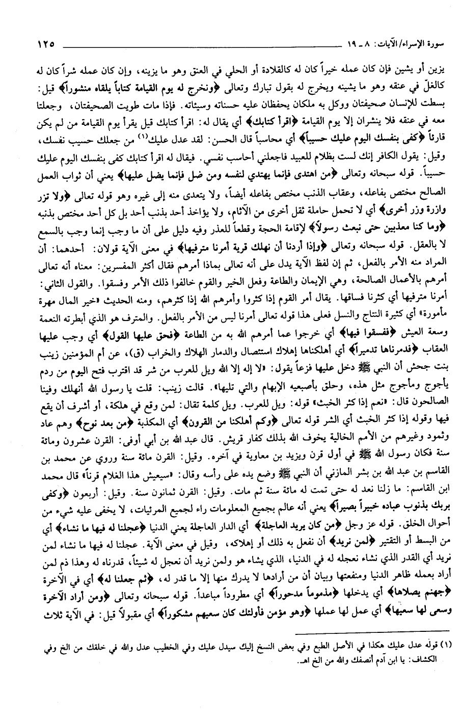 بسطت للإنسان صحيفتان ووكل به ملكان يحفظان عليه حسناته وسيئاته. فإذا مات طويت الصحيفتان، وجعلتا معه في عنقه فلا ينشران إلا يوم القيامة اقْرَأْ كِتابَكَ أي يقال له: اقرأ كتابك قيل يقرأ يوم القيامة من لم يكن قارئا كَفى بِنَفْسِكَ الْيَوْمَ عَلَيْكَ حَسِيباً أي محاسبا قال الحسن: لقد عدل عليك «1» من جعلك حسيب نفسك، وقيل: يقول الكافر إنك لست بظلام للعبيد فاجعلني أحاسب نفسي. فيقال له اقرأ كتابك كفى بنفسك اليوم عليك حسيبا. قوله سبحانه وتعالى مَنِ اهْتَدى فَإِنَّما يَهْتَدِي لِنَفْسِهِ وَمَنْ ضَلَّ فَإِنَّما يَضِلُّ عَلَيْها يعني أن ثواب العمل الصالح مختص بفاعله، وعقاب الذنب مختص بفاعله أيضا، ولا يتعدى منه إلى غيره وهو قوله تعالى وَلا تَزِرُ وازِرَةٌ وِزْرَ أُخْرى أي لا تحمل حاملة ثقل أخرى من الآثام، ولا يؤاخذ أحد بذنب أحد بل كل أحد مختص بذنبه وَما كُنَّا مُعَذِّبِينَ حَتَّى نَبْعَثَ رَسُولًا لإقامة الحجة وقطعا للعذر وفيه دليل على أن ما وجب إنما وجب بالسمع لا بالعقل. قوله سبحانه وتعالى وَإِذا أَرَدْنا أَنْ نُهْلِكَ قَرْيَةً أَمَرْنا مُتْرَفِيها