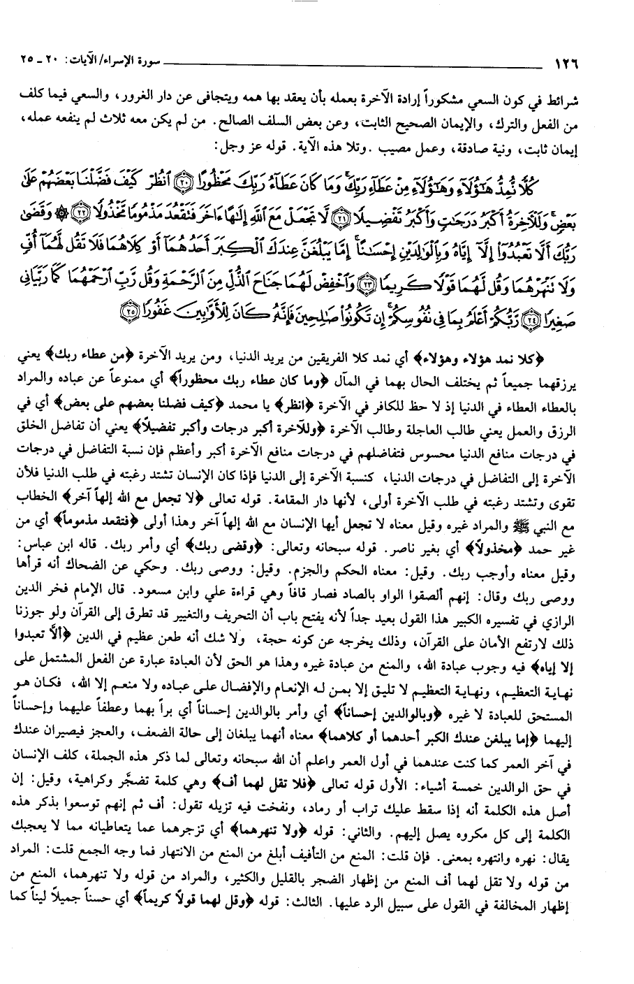كُلاًّ نُمِدُّ هؤُلاءِ وَهَؤُلاءِ مِنْ عَطاءِ رَبِّكَ وَما كانَ عَطاءُ رَبِّكَ مَحْظُوراً (20) انْظُرْ كَيْفَ فَضَّلْنا بَعْضَهُمْ عَلى بَعْضٍ وَلَلْآخِرَةُ أَكْبَرُ دَرَجاتٍ وَأَكْبَرُ تَفْضِيلاً (21) لا تَجْعَلْ مَعَ اللَّهِ إِلهاً آخَرَ فَتَقْعُدَ مَذْمُوماً مَخْذُولاً (22) وَقَضى رَبُّكَ أَلاَّ تَعْبُدُوا إِلاَّ إِيَّاهُ وَبِالْوالِدَيْنِ إِحْساناً إِمَّا يَبْلُغَنَّ عِنْدَكَ الْكِبَرَ أَحَدُهُما أَوْ كِلاهُما فَلا تَقُلْ لَهُما أُفٍّ وَلا تَنْهَرْهُما وَقُلْ لَهُما قَوْلاً كَرِيماً (23) وَاخْفِضْ لَهُما جَناحَ الذُّلِّ مِنَ الرَّحْمَةِ وَقُلْ رَبِّ ارْحَمْهُما كَما رَبَّيانِي صَغِيراً (24)