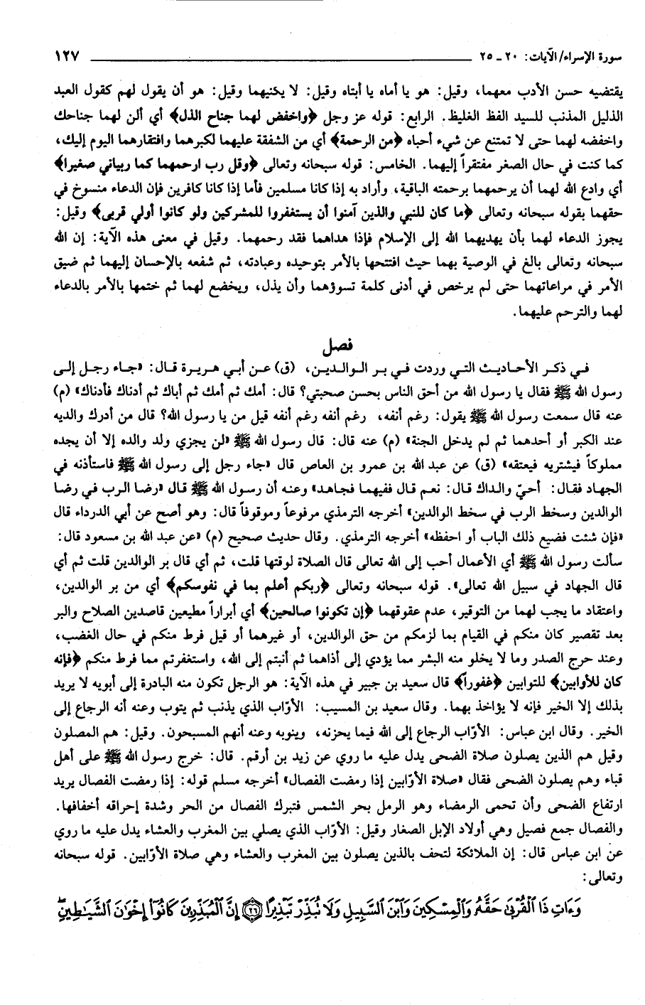 سألت رسول الله صلّى الله عليه وسلّم أي الأعمال أحب إلى الله تعالى قال الصلاة لوقتها قلت، ثم أي قال بر الوالدين قلت ثم أي قال الجهاد في سبيل الله تعالى». قوله سبحانه وتعالى رَبُّكُمْ أَعْلَمُ بِما فِي نُفُوسِكُمْ أي من بر الوالدين، واعتقاد ما يجب لهما من التوقير، عدم عقوقهما إِنْ تَكُونُوا صالِحِينَ أي أبرارا مطيعين قاصدين الصلاح والبر بعد تقصير كان منكم في القيام بما لزمكم من حق الوالدين، أو غيرهما أو قيل فرط منكم في حال الغضب، وعند حرج الصدر وما لا يخلو منه البشر مما يؤدي إلى أذاهما ثم أنبتم إلى الله، واستغفرتم مما فرط منكم فَإِنَّهُ كانَ لِلْأَوَّابِينَ للتوابين غَفُوراً قال سعيد بن جبير في هذه الآية: هو الرجل تكون منه البادرة إلى أبويه لا يريد بذلك إلا الخير فإنه لا يؤاخذ بهما. وقال سعيد بن المسيب: الأوّاب الذي يذنب ثم يتوب وعنه أنه الرجاع إلى الخير. وقال ابن عباس: الأوّاب الرجاع إلى الله فيما يحزنه، وينوبه وعنه أنهم المسبحون. وقيل: هم المصلون وقيل هم الذين يصلون صلاة الضحى يدل عليه ما روي عن زيد بن أرقم. قال: خرج رسول الله صلّى الله عليه وسلّم على أهل قباء وهم يصلون الضحى فقال «صلاة الأوّابين إذا رمضت الفصال» أخرجه مسلم قوله: إذا رمضت الفصال يريد ارتفاع الضحى وأن تحمى الرمضاء وهو الرمل بحر الشمس فتبرك الفصال من الحر وشدة إحراقه أخفافها.