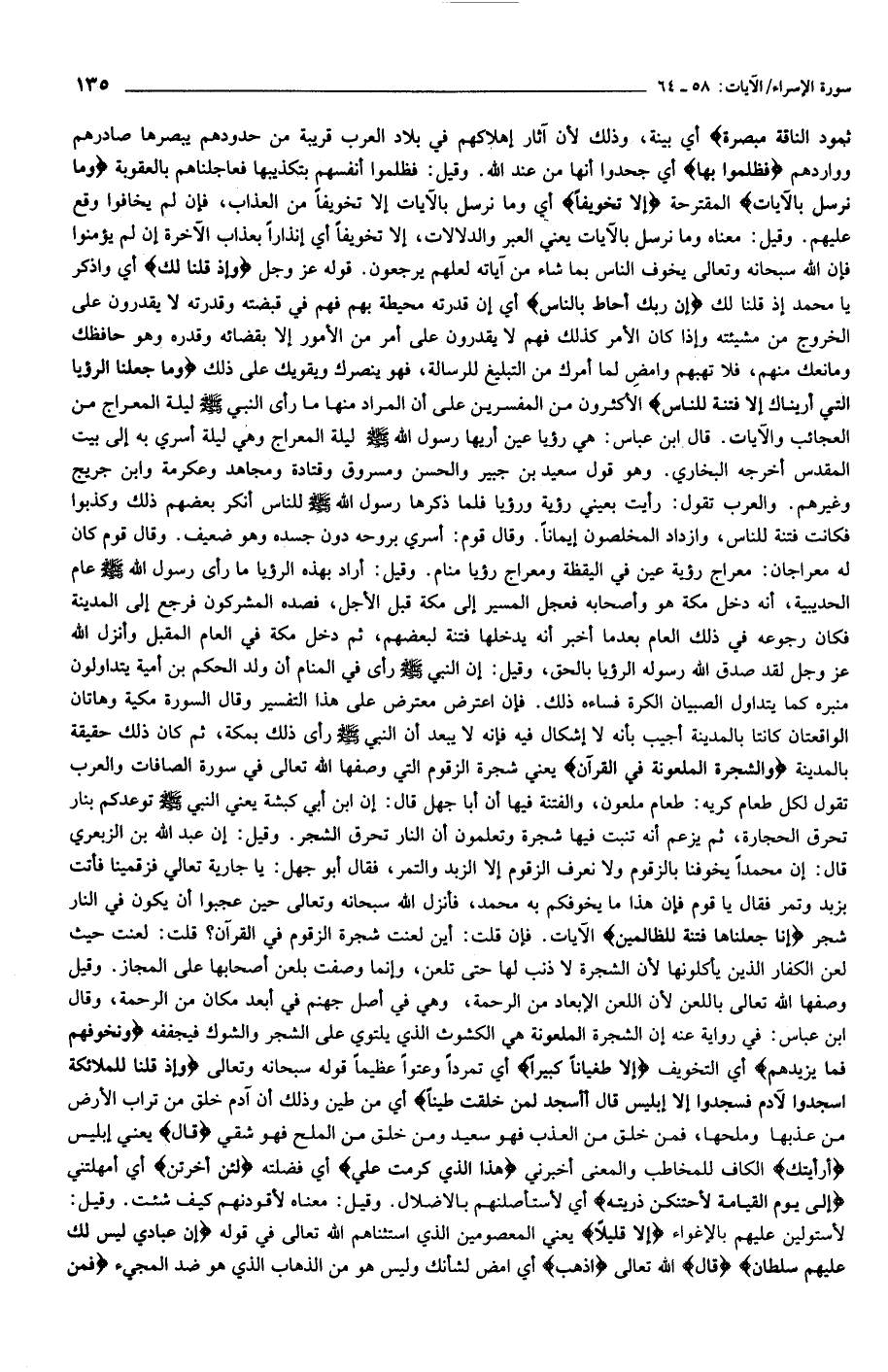 أي بينة، وذلك لأن آثار إهلاكهم في بلاد العرب قريبة من حدودهم يبصرها صادرهم وواردهم فَظَلَمُوا بِها أي جحدوا أنها من عند الله. وقيل: فظلموا أنفسهم بتكذيبها فعاجلناهم بالعقوبة وَما نُرْسِلُ بِالْآياتِ المقترحة إِلَّا تَخْوِيفاً أي وما نرسل بالآيات إلا تخويفا من العذاب، فإن لم يخافوا وقع عليهم. وقيل: معناه وما نرسل بالآيات يعني العبر والدلالات، إلا تخويفا أي إنذارا بعذاب الآخرة إن لم يؤمنوا فإن الله سبحانه وتعالى يخوف الناس بما شاء من آياته لعلهم يرجعون. قوله عز وجل وَإِذْ قُلْنا لَكَ أي واذكر يا محمد إذ قلنا لك إِنَّ رَبَّكَ أَحاطَ بِالنَّاسِ أي إن قدرته محيطة بهم فهم في قبضته وقدرته لا يقدرون على الخروج من مشيئته وإذا كان الأمر كذلك فهم لا يقدرون على أمر من الأمور إلا بقضائه وقدره وهو حافظك ومانعك منهم، فلا تهبهم وامض لما أمرك من التبليغ للرسالة، فهو ينصرك ويقويك على ذلك وَما جَعَلْنَا الرُّؤْيَا الَّتِي أَرَيْناكَ إِلَّا فِتْنَةً لِلنَّاسِ الأكثرون من المفسرين على أن المراد منها ما رأى النبي صلّى الله عليه وسلّم ليلة المعراج من العجائب والآيات. قال ابن عباس: هي رؤيا عين أريها رسول الله صلّى الله عليه وسلّم ليلة المعراج وهي ليلة أسري به إلى بيت المقدس أخرجه البخاري. وهو قول سعيد بن جبير والحسن ومسروق وقتادة ومجاهد وعكرمة وابن جريج وغيرهم. والعرب تقول: رأيت بعيني رؤية ورؤيا فلما ذكرها رسول الله صلّى الله عليه وسلّم للناس أنكر بعضهم ذلك وكذبوا فكانت فتنة للناس، وازداد المخلصون إيمانا. وقال قوم: أسري بروحه دون جسده وهو ضعيف. وقال قوم كان له معراجان: معراج رؤية عين في اليقظة ومعراج رؤيا منام. وقيل: أراد بهذه الرؤيا ما رأى رسول الله صلّى الله عليه وسلّم عام الحديبية، أنه دخل مكة هو وأصحابه فعجل المسير إلى مكة قبل الأجل، فصده المشركون فرجع إلى المدينة فكان رجوعه في ذلك العام بعد ما أخبر أنه يدخلها فتنة لبعضهم، ثم دخل مكة في العام المقبل وأنزل الله عز وجل لقد صدق الله رسوله الرؤيا بالحق، وقيل: إن النبي صلّى الله عليه وسلّم رأى في المنام أن ولد الحكم بن أمية يتداولون منبره كما يتداول الصبيان الكرة فساءه ذلك. فإن اعترض معترض على هذا التفسير وقال السورة مكية وهاتان الواقعتان كانتا بالمدينة أجيب بأنه لا إشكال فيه فإنه لا يبعد أن النبي صلّى الله عليه وسلّم رأى ذلك بمكة، ثم كان ذلك حقيقة بالمدينة وَالشَّجَرَةَ الْمَلْعُونَةَ فِي الْقُرْآنِ يعني شجرة الزقوم التي وصفها الله تعالى في سورة الصافات والعرب تقول لكل طعام كريه: طعام ملعون، والفتنة فيها أن أبا جهل قال: إن ابن أبي كبشة يعني النبي صلّى الله عليه وسلّم توعدكم بنار تحرق الحجارة، ثم يزعم أنه تنبت فيها شجرة وتعلمون أن النار تحرق الشجر. وقيل: إن عبد الله بن الزبعري قال: إن محمدا يخوفنا بالزقوم ولا نعرف الزقوم إلا الزبد والتمر، فقال أبو جهل: يا جارية تعالي فزقمينا فأتت بزبد وتمر فقال يا قوم فإن هذا ما يخوفكم به محمد، فأنزل الله سبحانه وتعالى حين عجبوا أن يكون في النار شجر إِنَّا جَعَلْناها فِتْنَةً لِلظَّالِمِينَ الآيات. فإن قلت: أين لعنت شجرة
