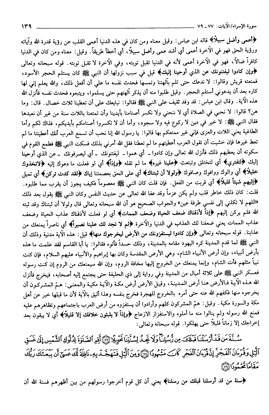 سُنَّةَ مَنْ قَدْ أَرْسَلْنا قَبْلَكَ مِنْ رُسُلِنا وَلا تَجِدُ لِسُنَّتِنا تَحْوِيلاً (77) أَقِمِ الصَّلاةَ لِدُلُوكِ الشَّمْسِ إِلى غَسَقِ اللَّيْلِ وَقُرْآنَ الْفَجْرِ إِنَّ قُرْآنَ الْفَجْرِ كانَ مَشْهُوداً (78) وَمِنَ اللَّيْلِ فَتَهَجَّدْ بِهِ نافِلَةً لَكَ عَسى أَنْ يَبْعَثَكَ رَبُّكَ مَقاماً مَحْمُوداً (79)